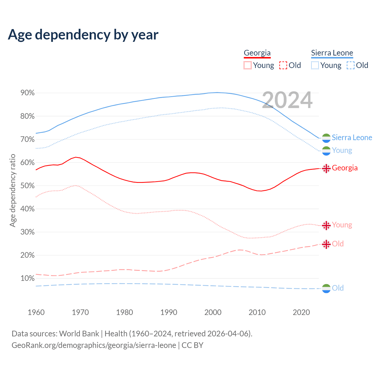 - The share of old-age demographic (65+) in Georgia is 15.6% vs 3.24% in Sierra Leone.