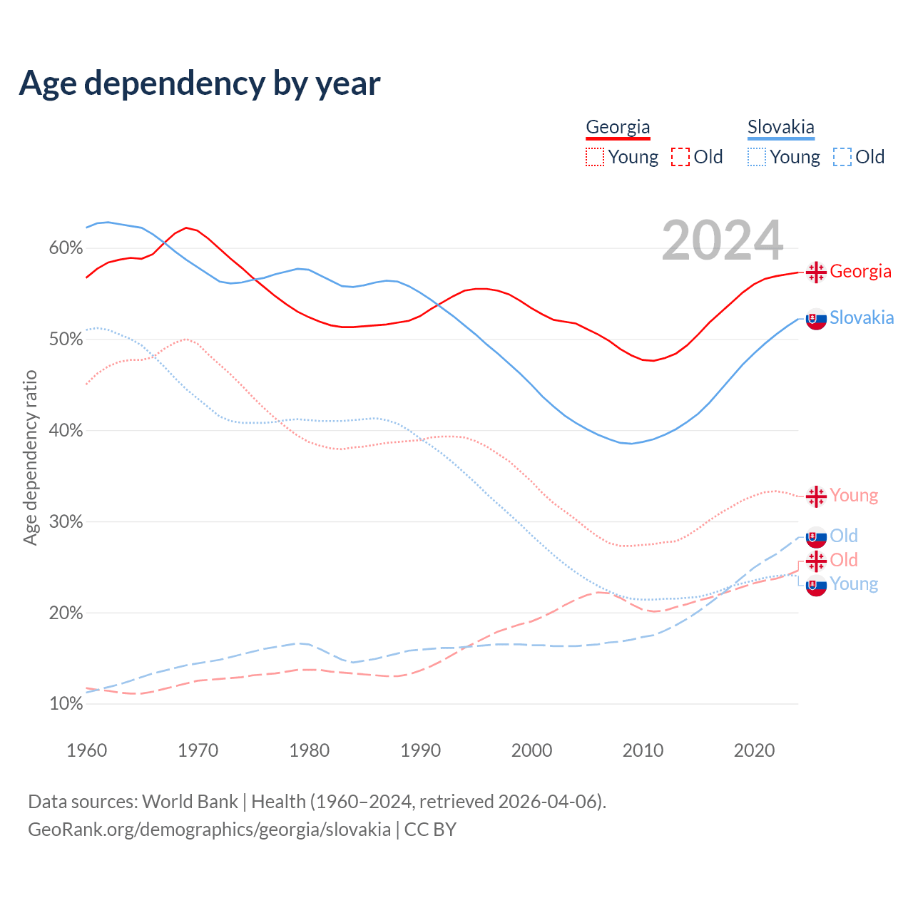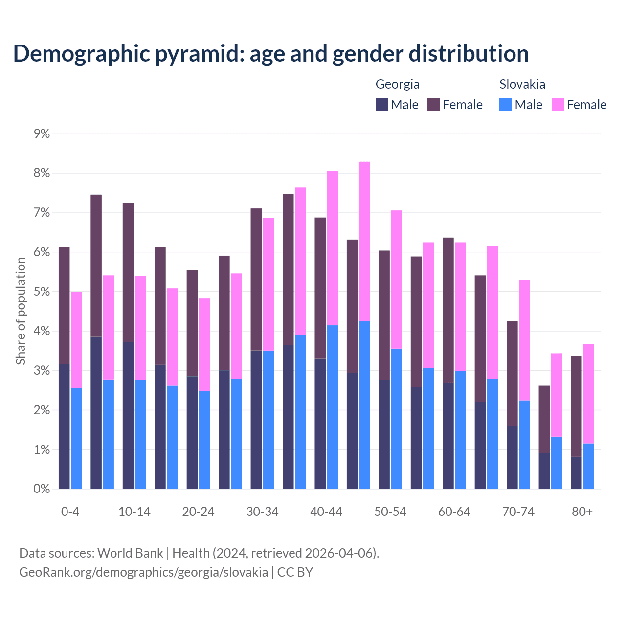 - Georgia is ranked 59/196 by median age (oldest to youngest) vs 31/196 for Slovakia.