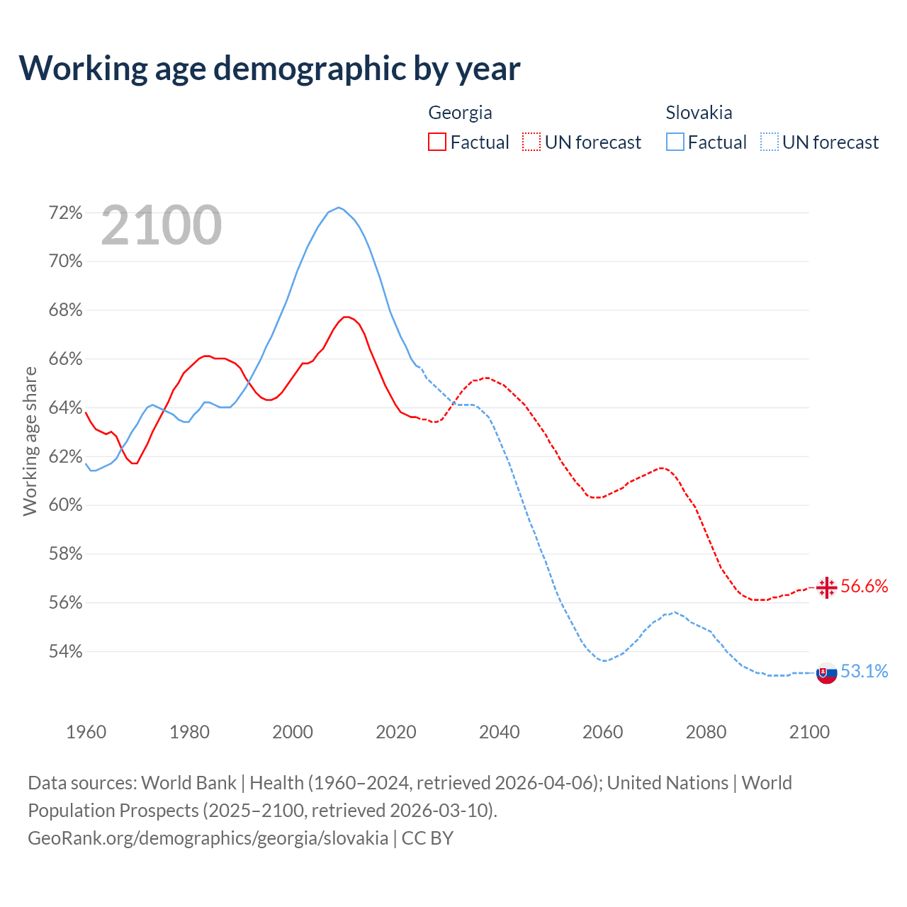 Median age Georgia vs Slovakia, 1960-2100