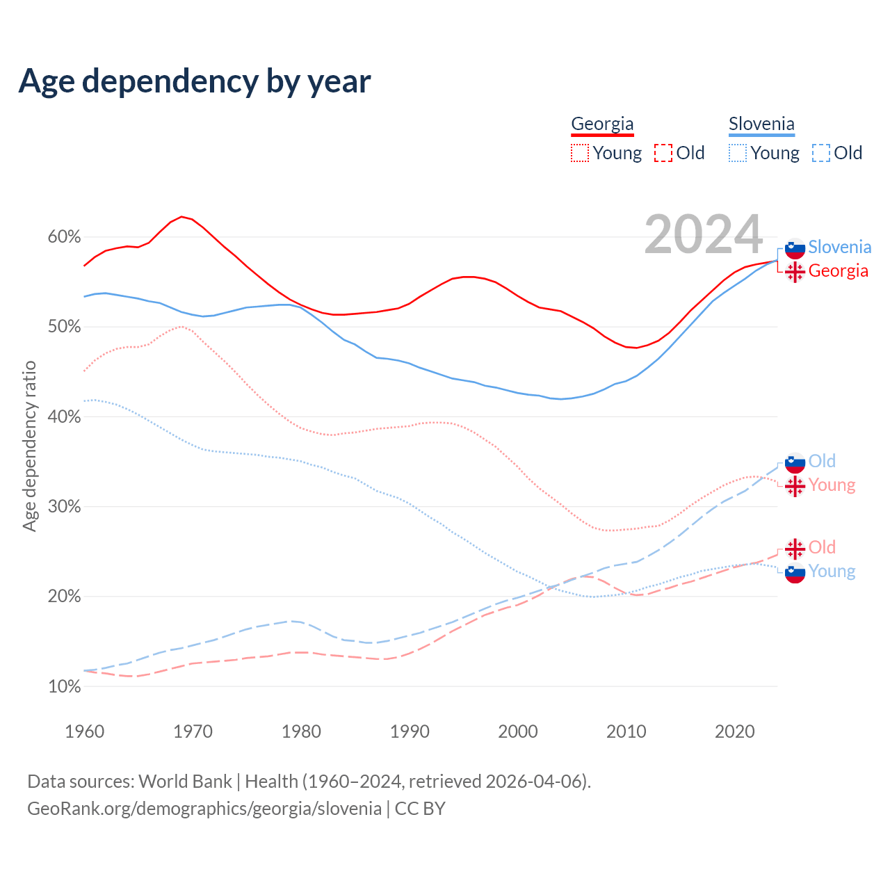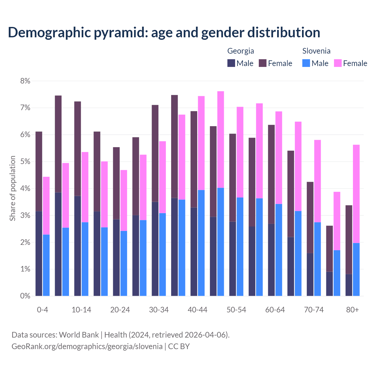 - Georgia is ranked 59/196 by median age (oldest to youngest) vs 14/196 for Slovenia.
