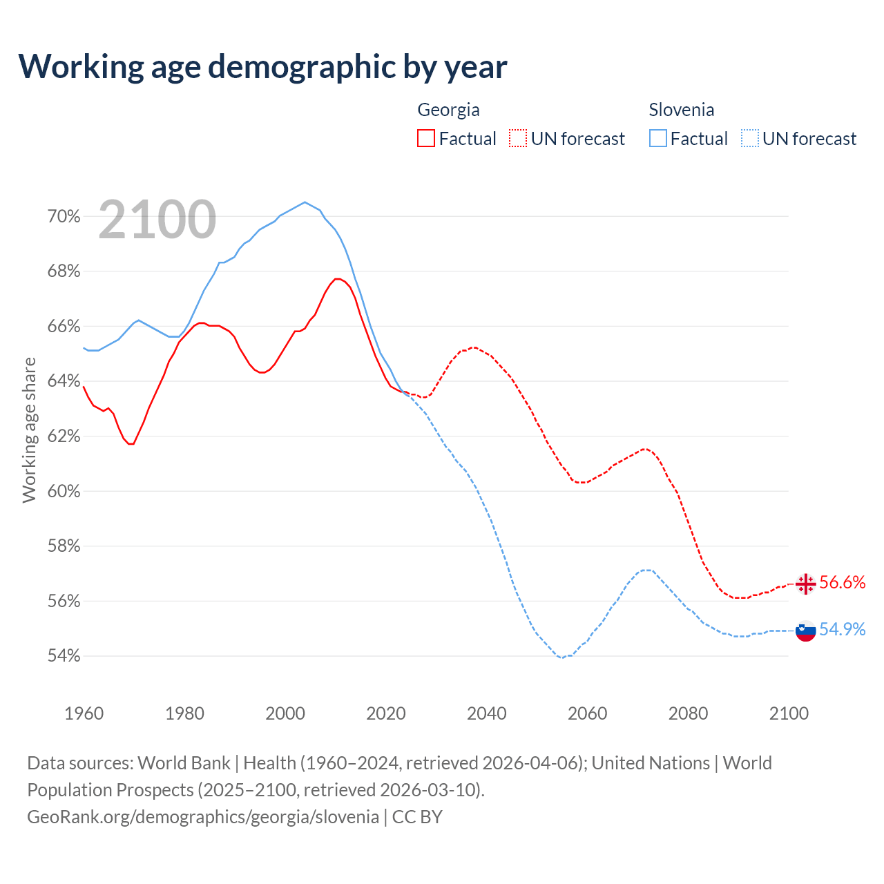 Median age Georgia vs Slovenia, 1960-2100