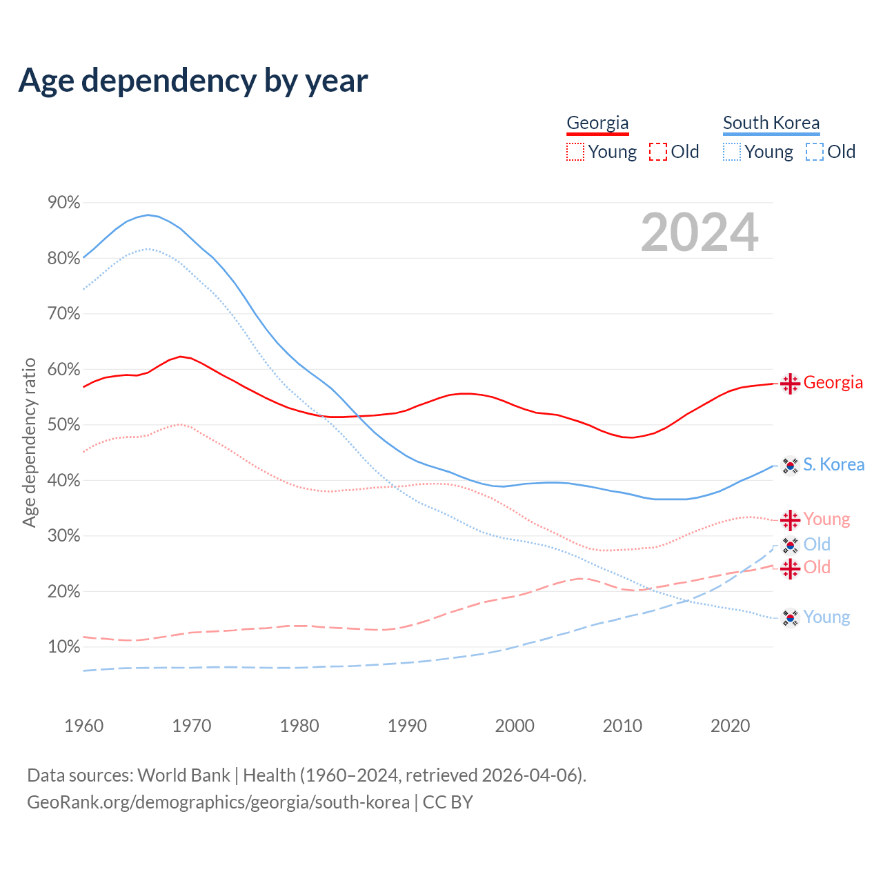 - Georgia is ranked 59/196 by median age (oldest to youngest) vs 10/196 for South Korea.