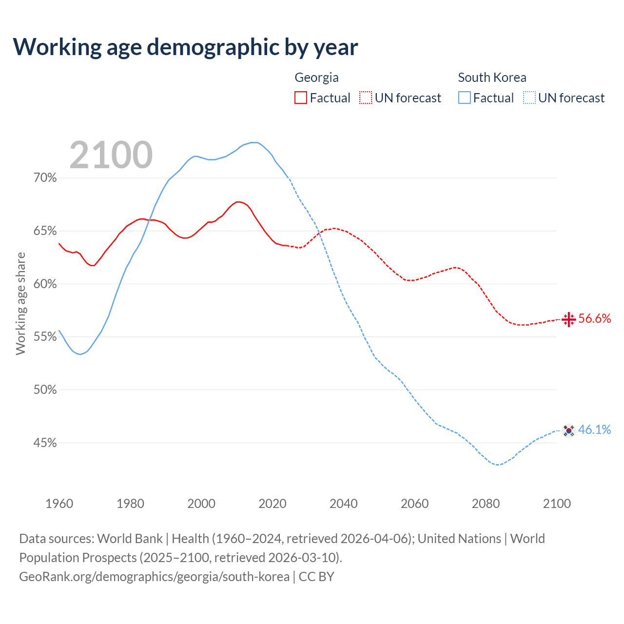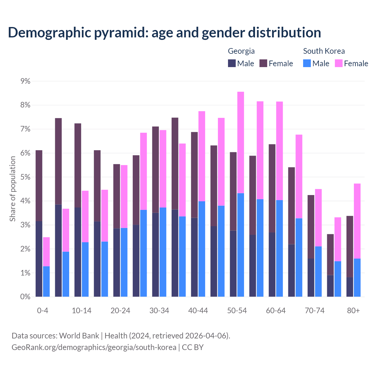 - As of 2026, the population of Georgia is 3.7M vs 51.6M in South Korea - 14 times difference.