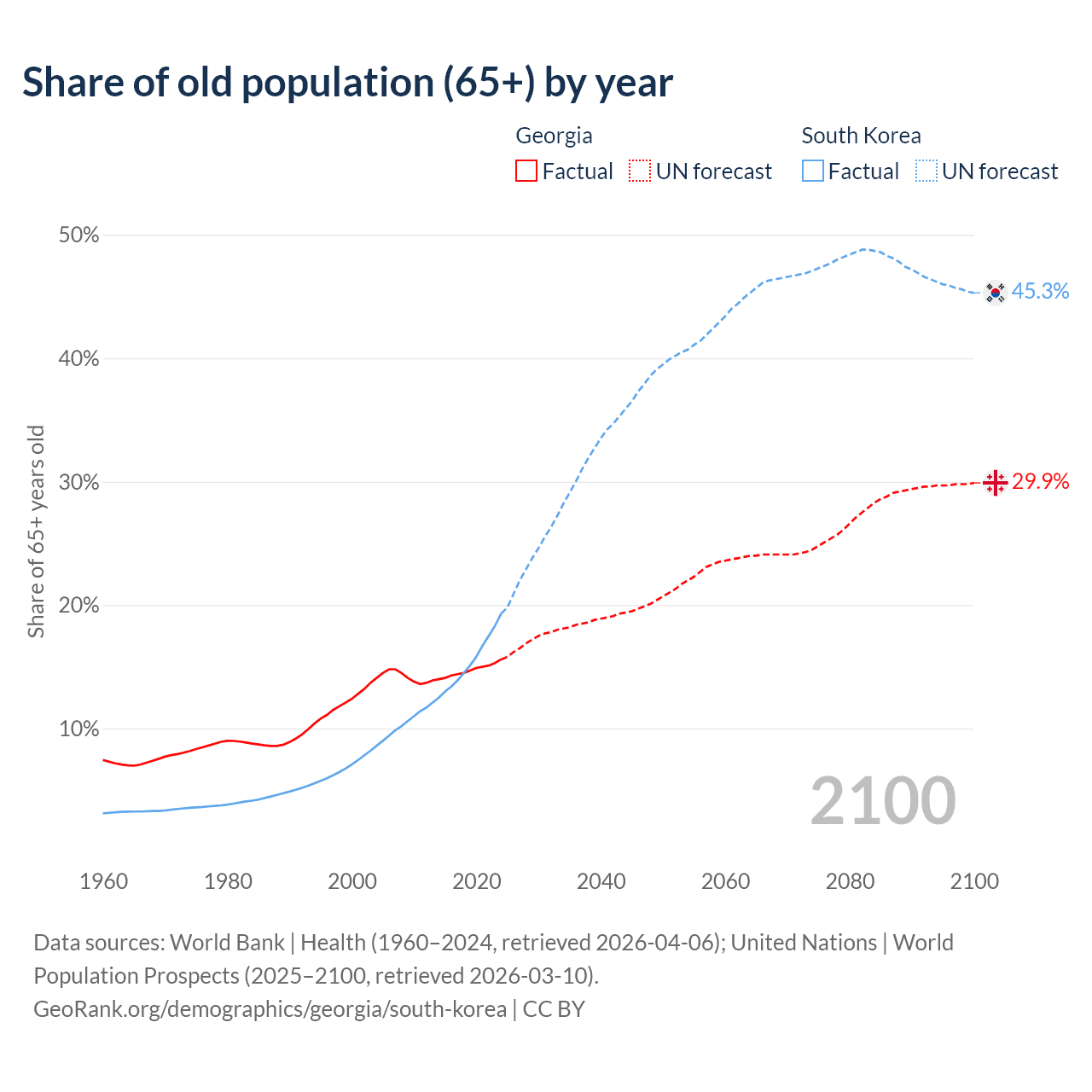 The share of older people aged 65 and over is 15.6% in Georgia and 19.3% in South Korea. Life expectancy in Georgia compared to South Korea .