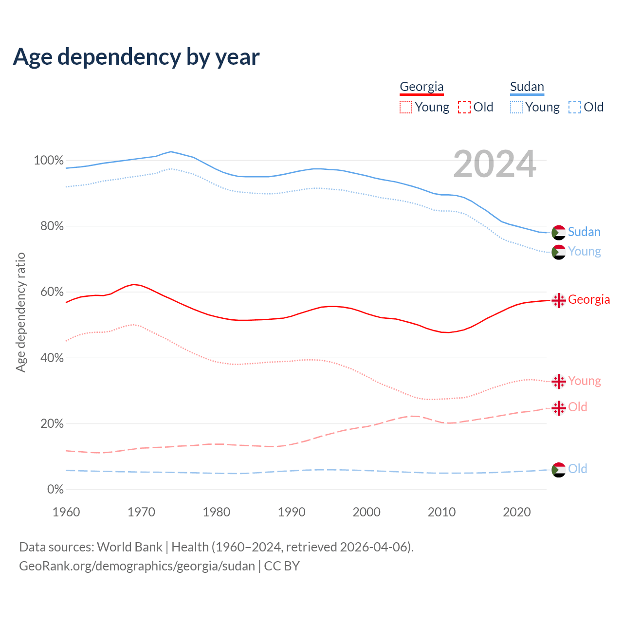 - Georgia is ranked 59/196 by median age (oldest to youngest) vs 172/196 for Sudan.