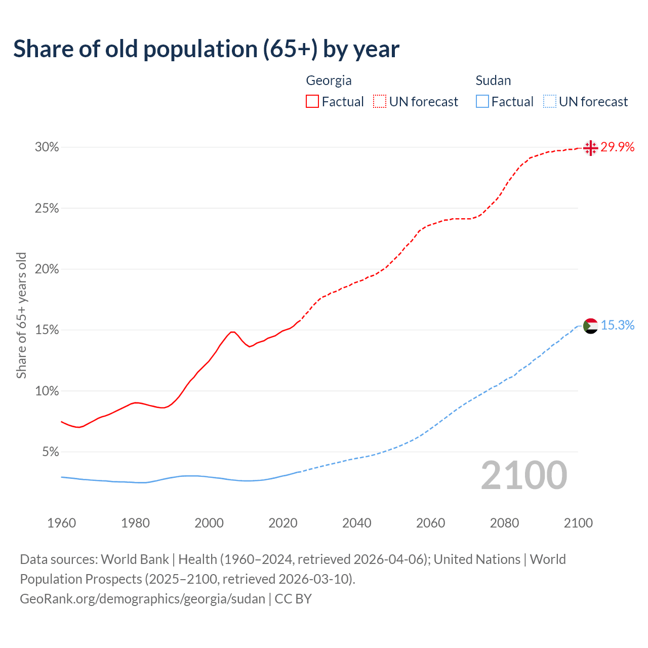- The share of old-age demographic (65+) in Georgia is 15.6% vs 3.3% in Sudan.