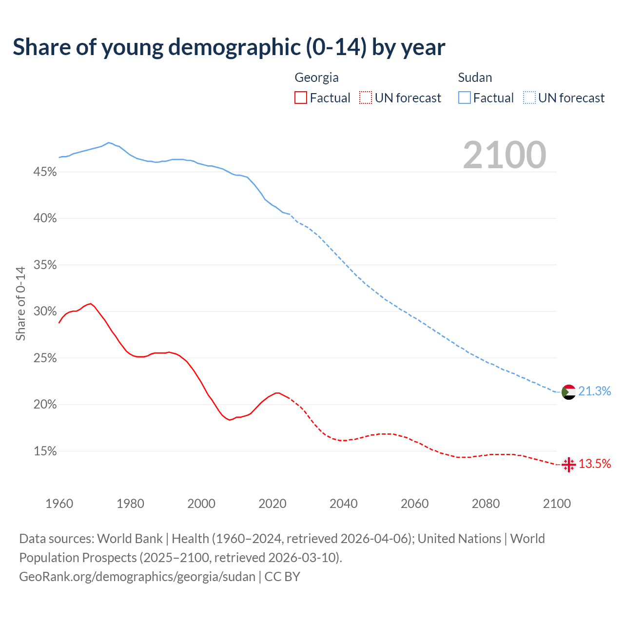 - The share of young demographic (0-15 years old) in Georgia is 20.8% vs 40.5% in Sudan.