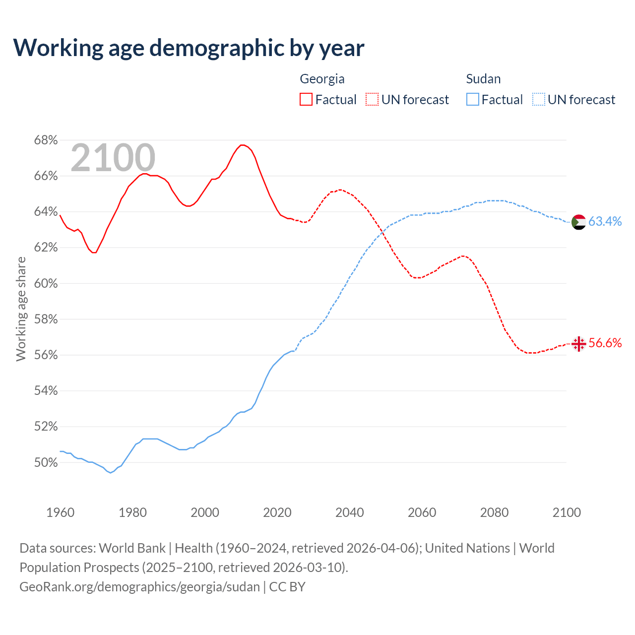 - Georgia has 2.35M working age adults (aged 15-64) vs 30M in Sudan.