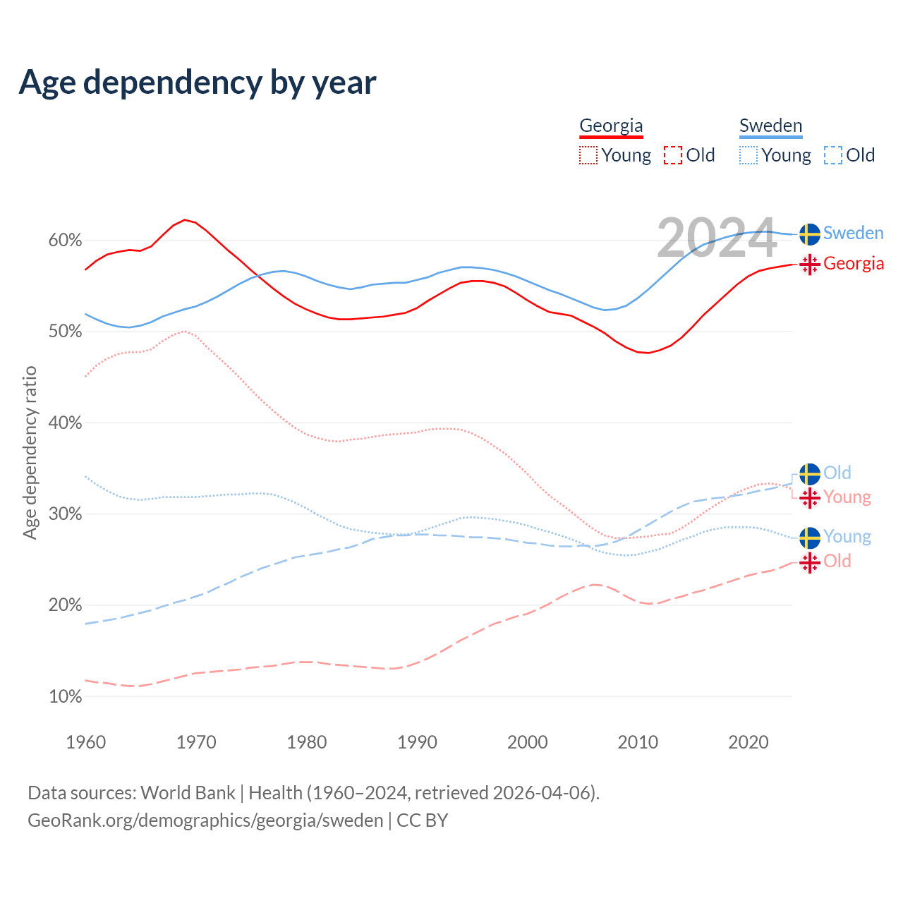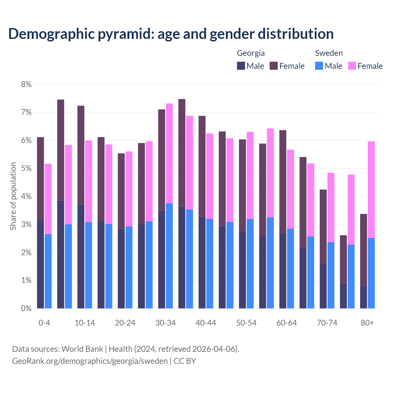 - Georgia is ranked 59/196 by median age (oldest to youngest) vs 39/196 for Sweden.