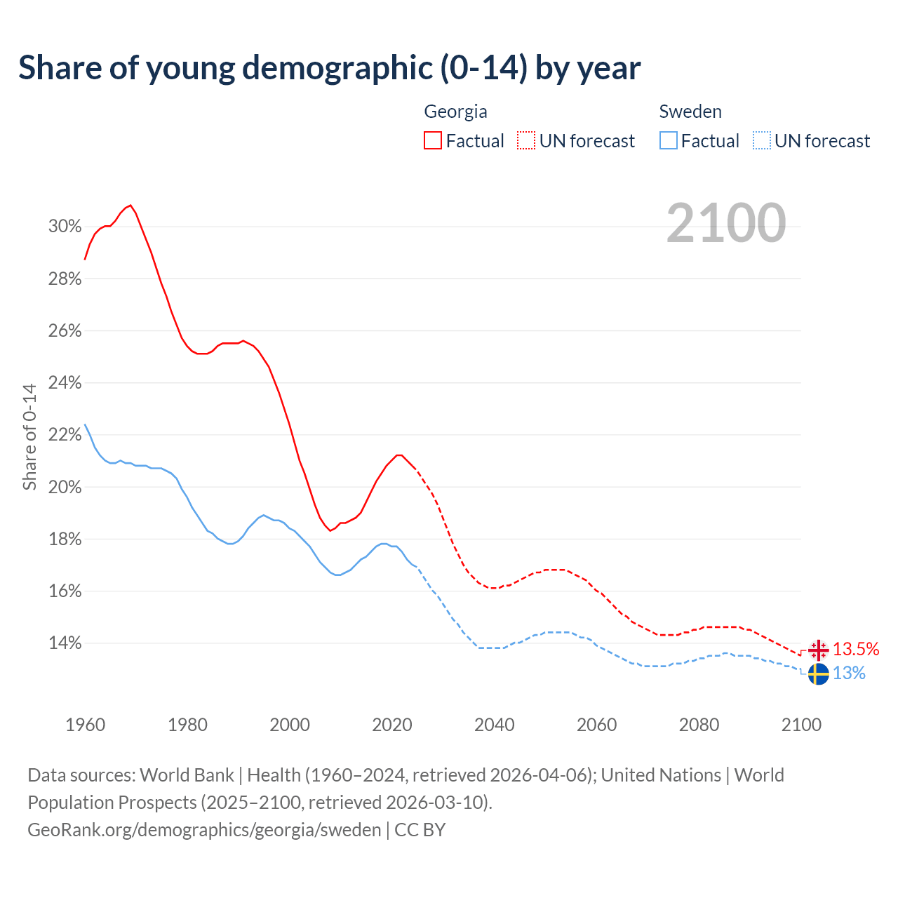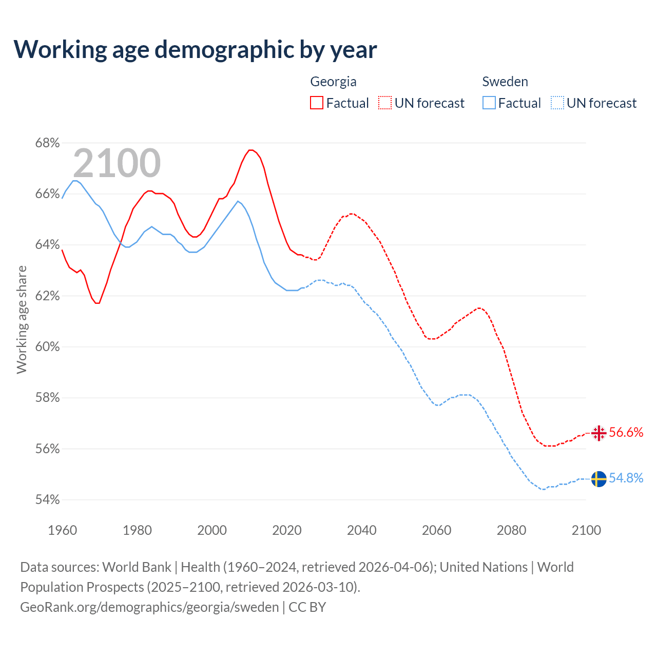 Median age Georgia vs Sweden, 1960-2100