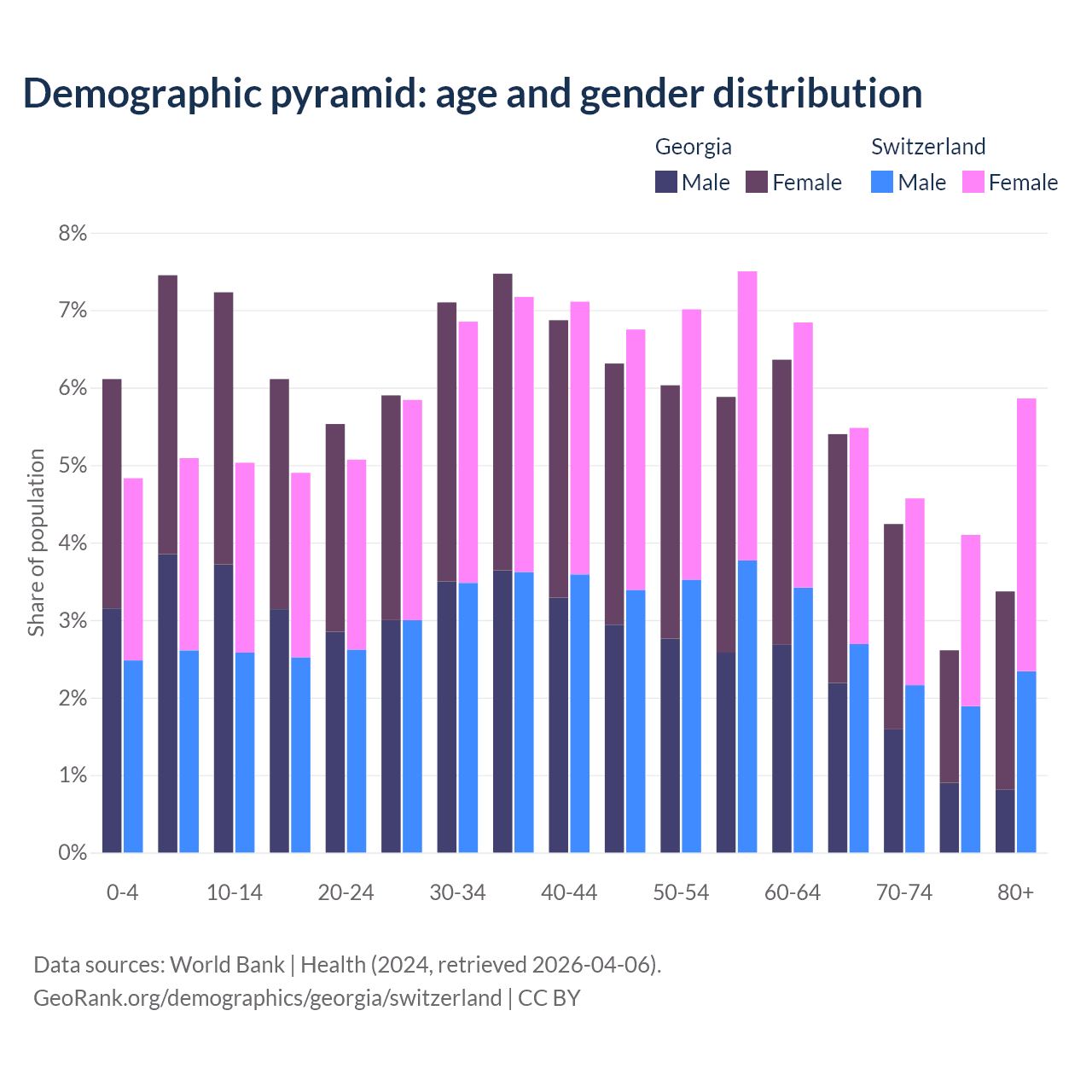 - Georgia is ranked 59/196 by median age (oldest to youngest) vs 24/196 for Switzerland.