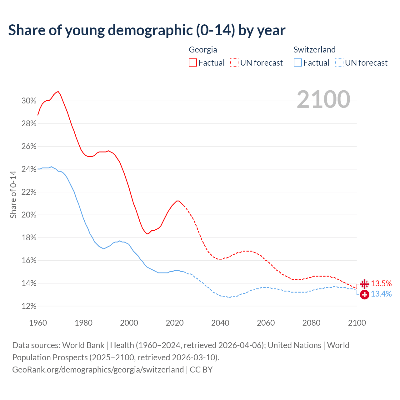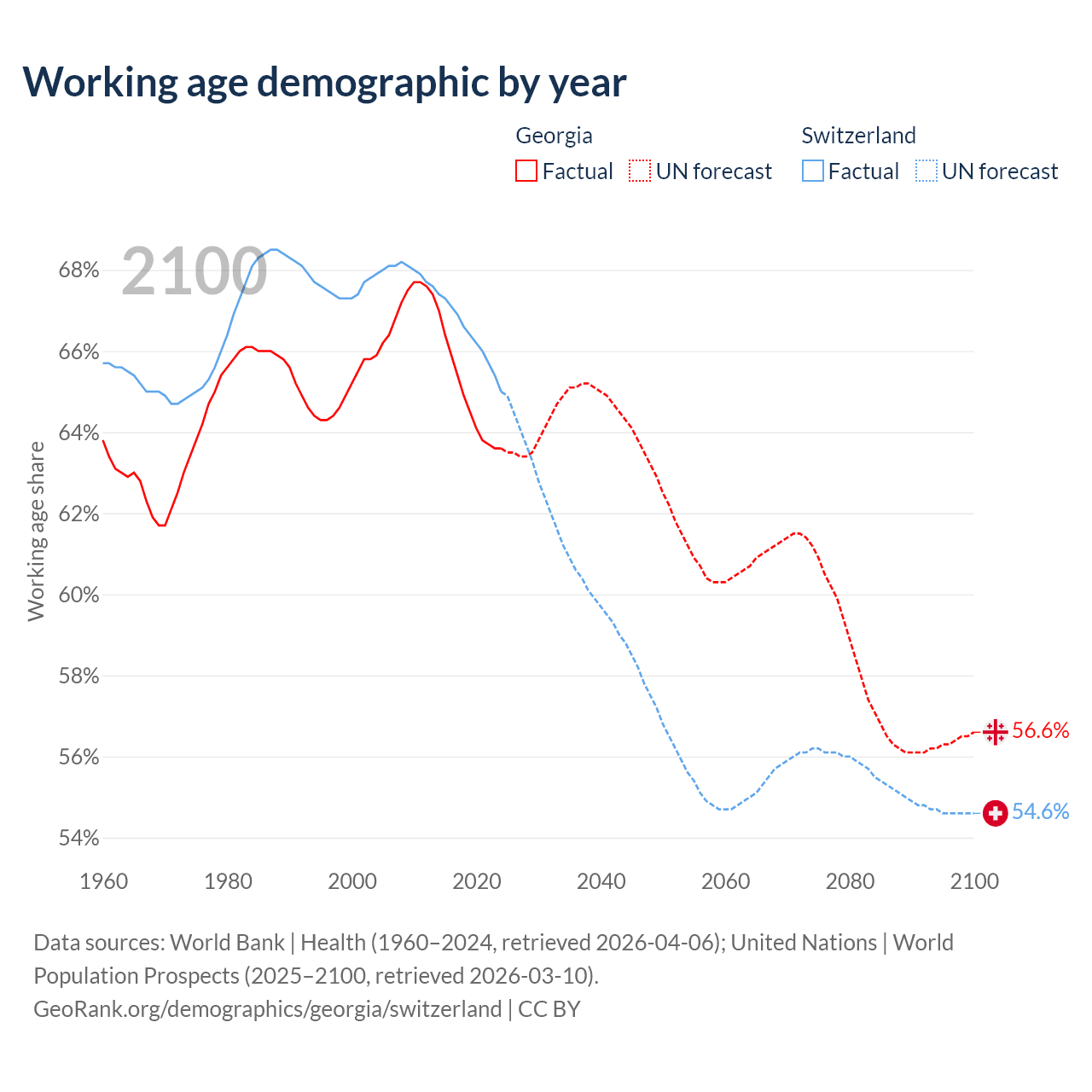 Median age Georgia vs Switzerland, 1960-2100