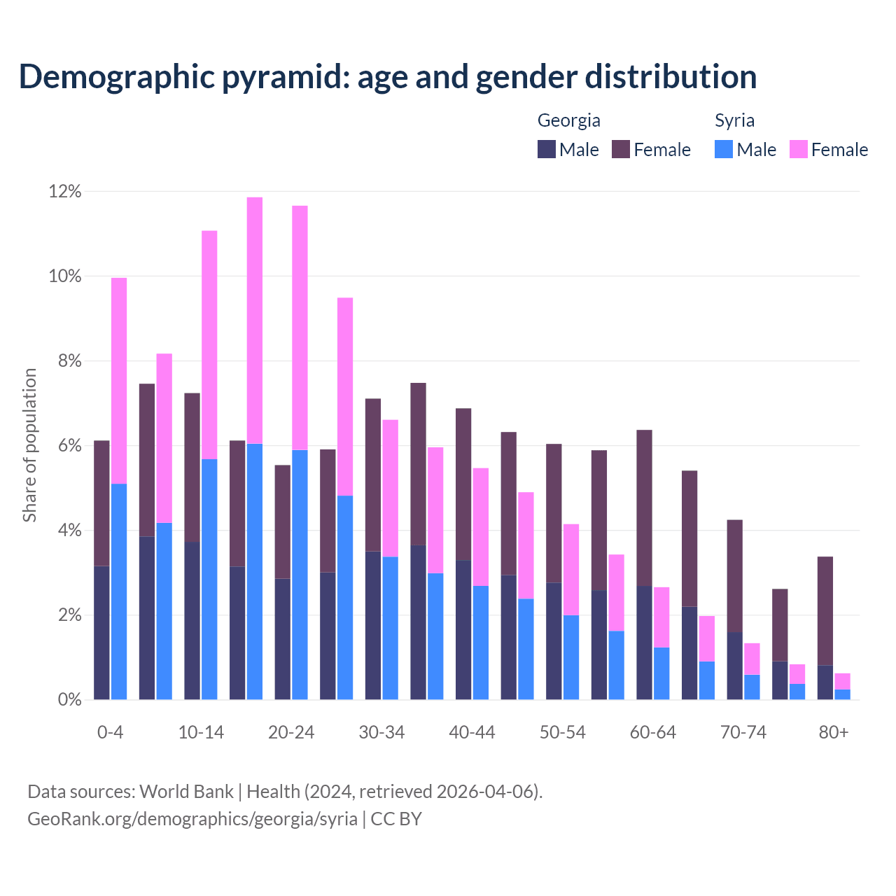 - The share of old-age demographic (65+) in Georgia is 15.6% vs 4.74% in Syria.