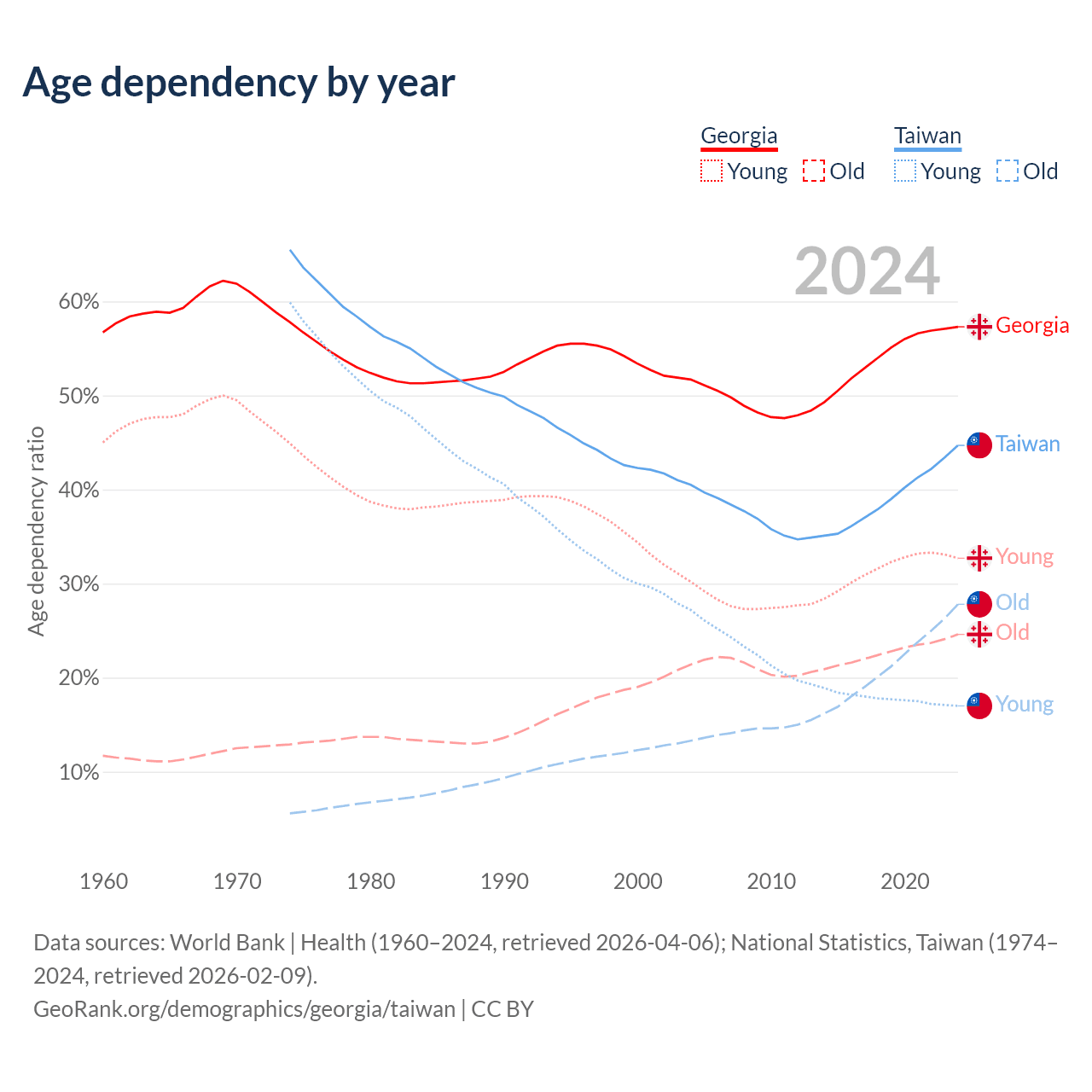Data sources: World Bank | Health (1960–2024, retrieved 2026-04-06); U.S. Census Bureau (1960–2024, retrieved 2026-02-08); National Statistics, Taiwan (1974–2024, retrieved 2026-02-09).