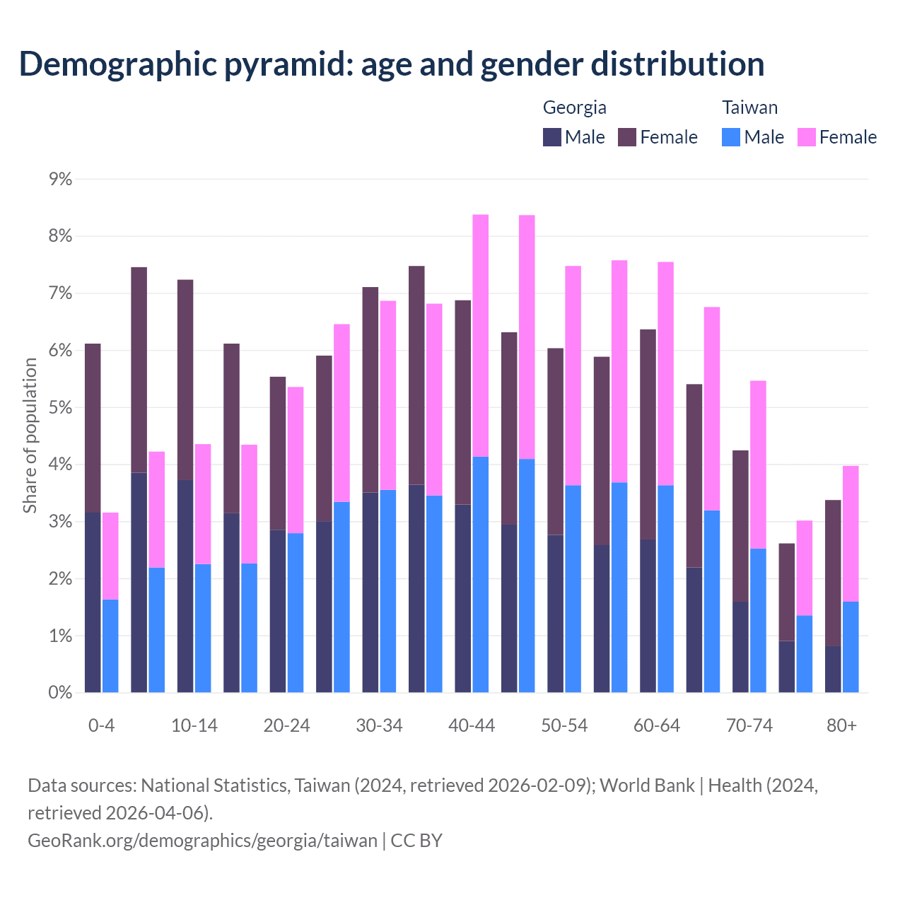 - As of 2026, the population of Georgia is 3.7M vs 23.2M in Taiwan - 6.28 times difference.