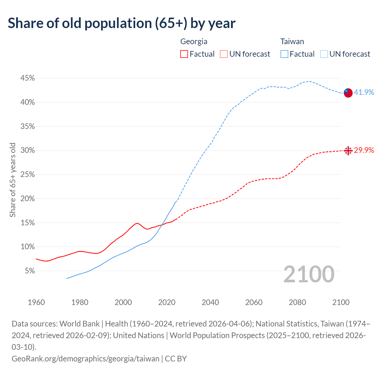 The share of older people aged 65 and over is 15.6% in Georgia and 19.2% in Taiwan. Life expectancy in Georgia compared to Taiwan .
