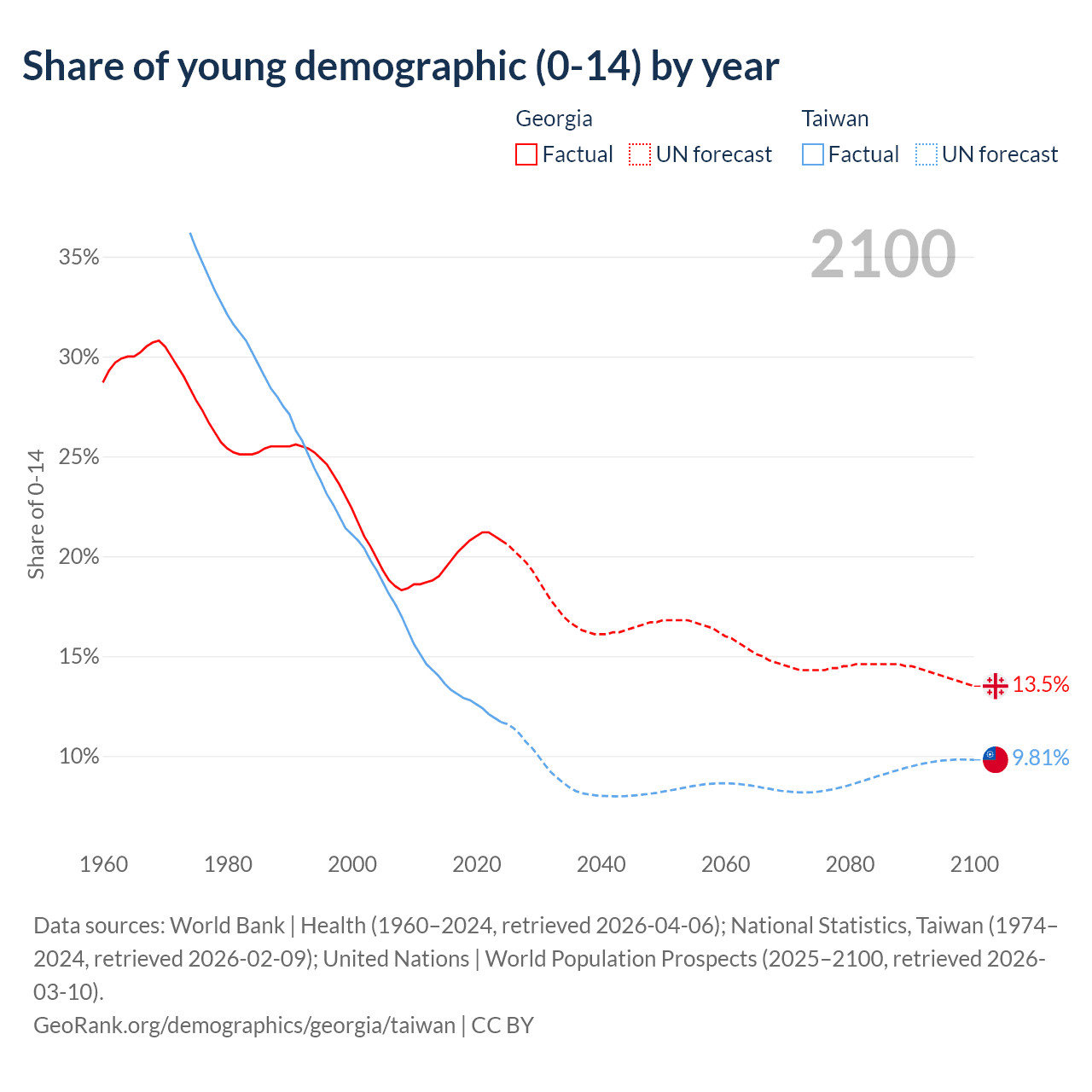 - The share of young demographic (0-15 years old) in Georgia is 20.8% vs 11.7% in Taiwan.