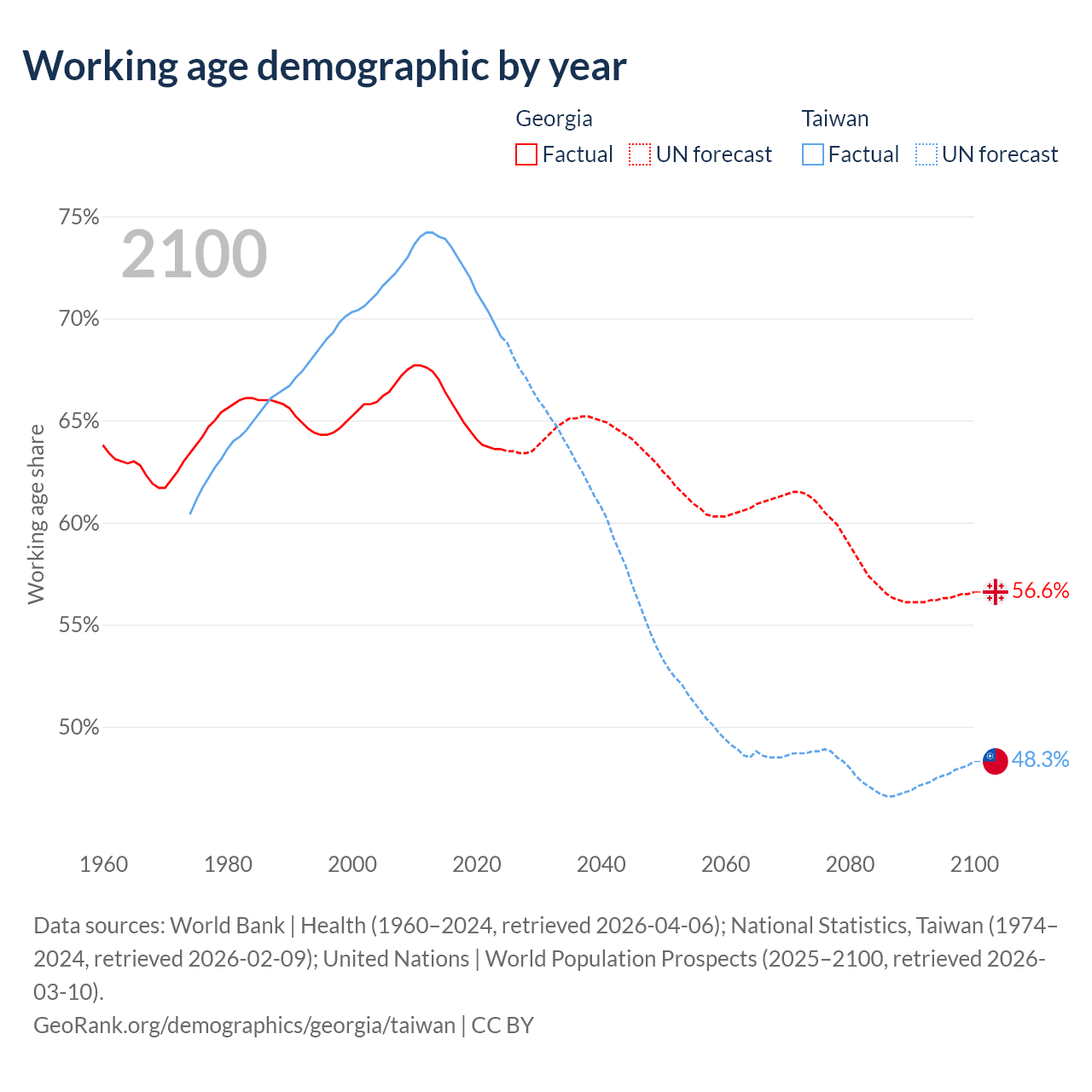 - Georgia has 2.35M working age adults (aged 15-64) vs 16.1M in Taiwan.