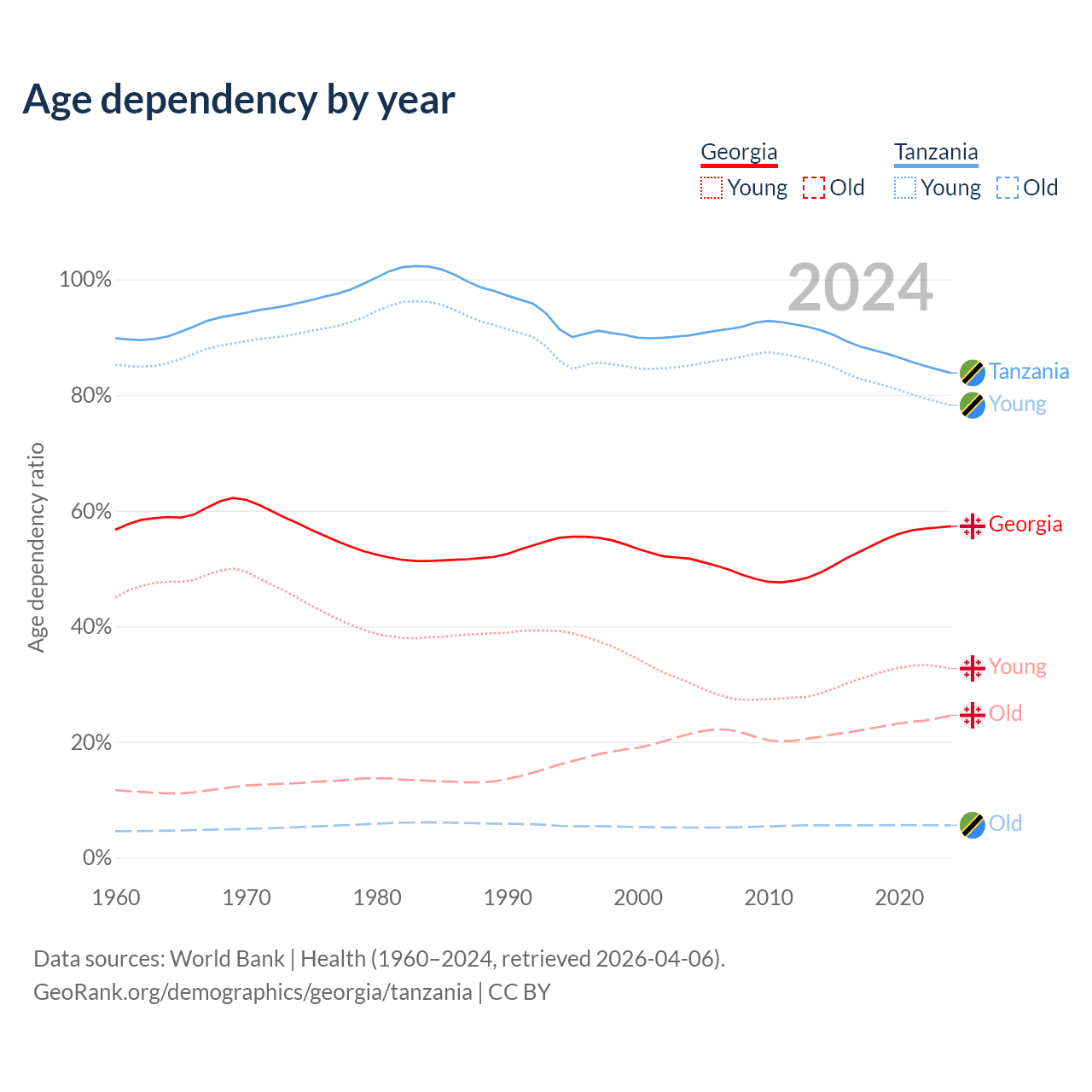 - Georgia is ranked 59/196 by median age (oldest to youngest) vs 184/196 for Tanzania.