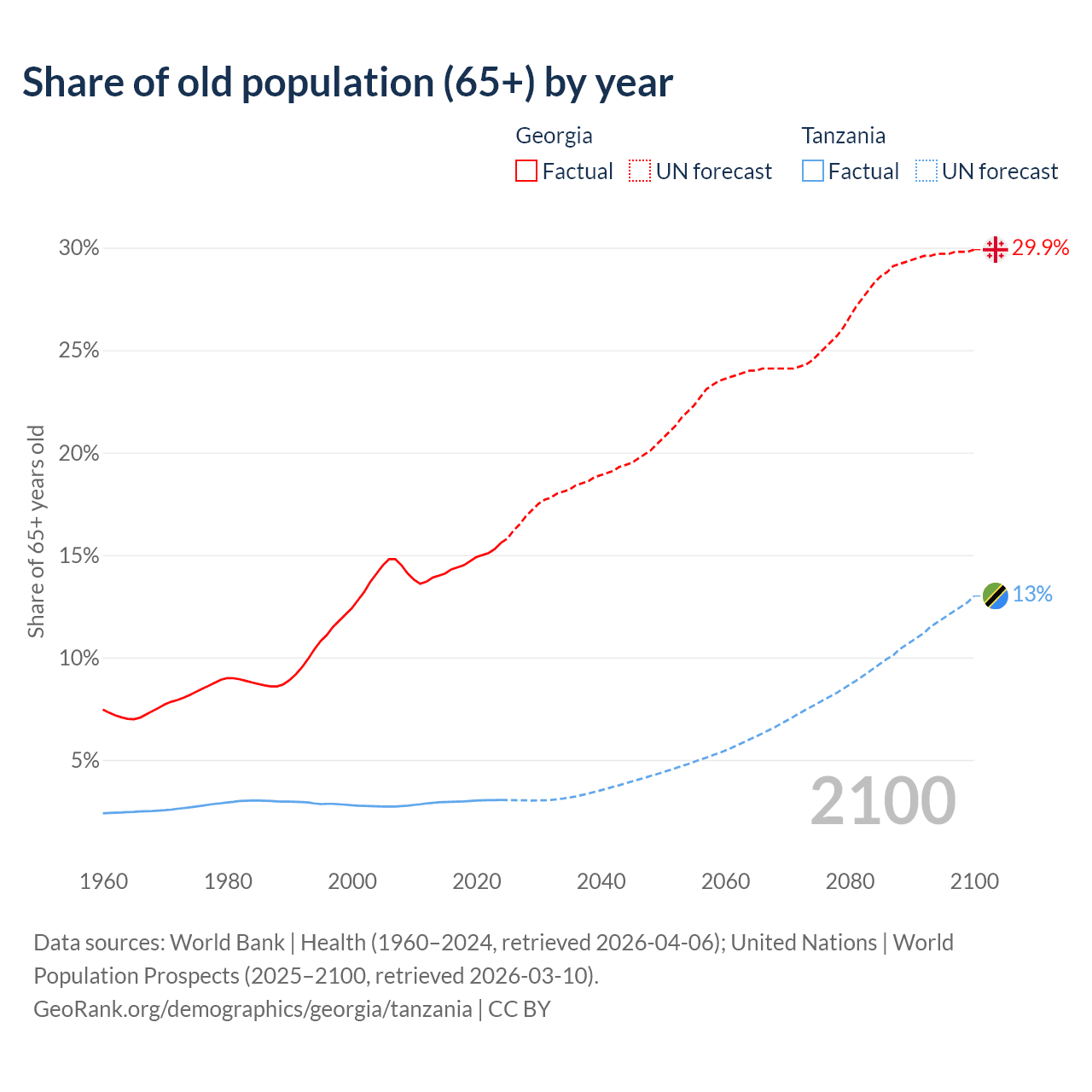 The share of older people aged 65 and over is 15.6% in Georgia and 3.05% in Tanzania. Life expectancy in Georgia compared to Tanzania .