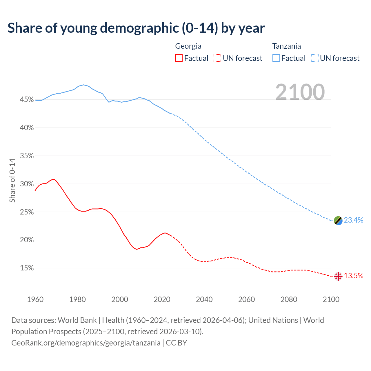 - The share of young demographic (0-15 years old) in Georgia is 20.8% vs 42.5% in Tanzania.