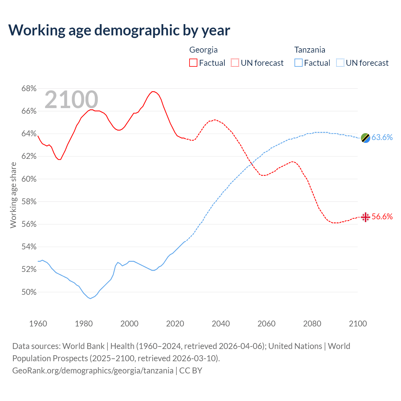 - Georgia has 2.35M working age adults (aged 15-64) vs 39.8M in Tanzania.