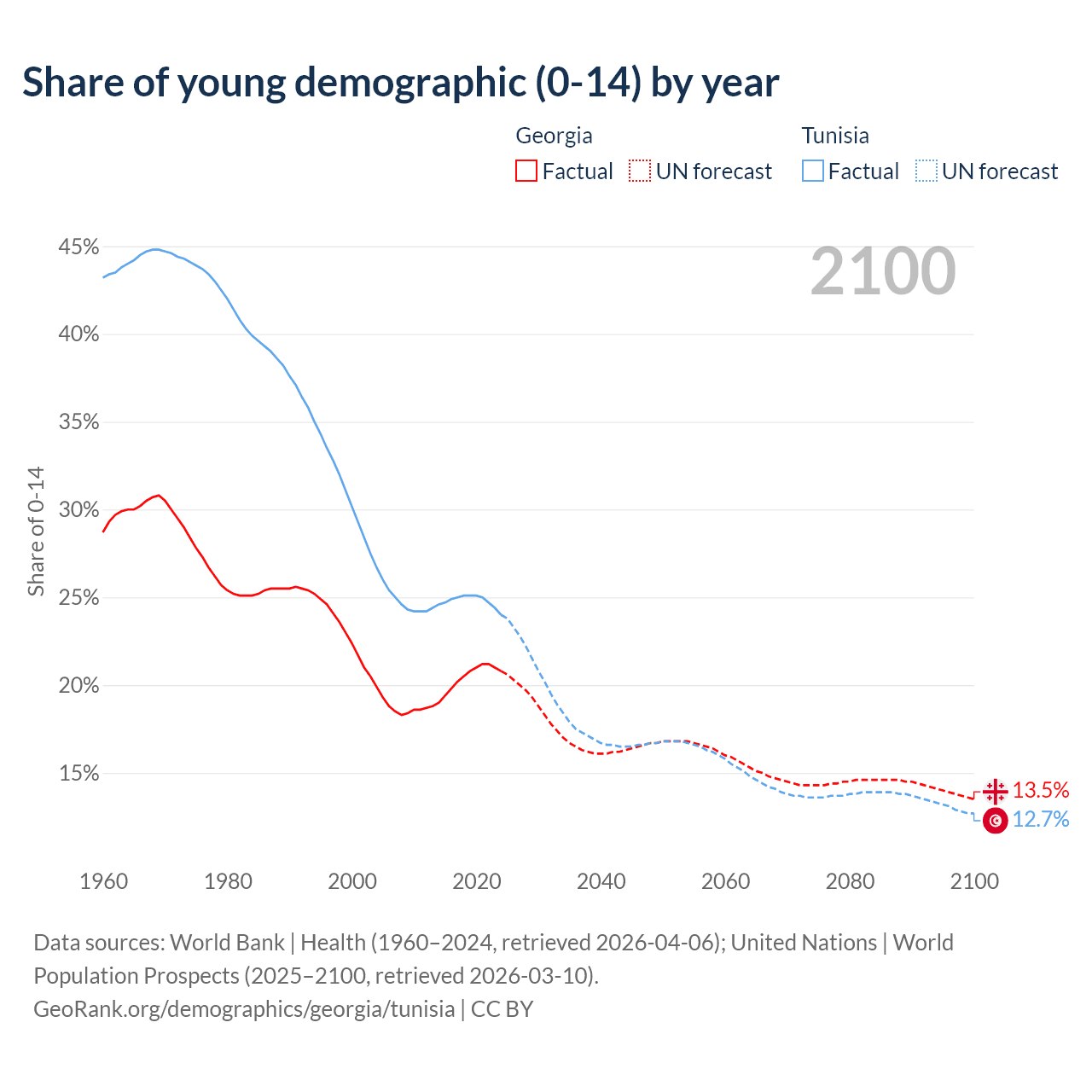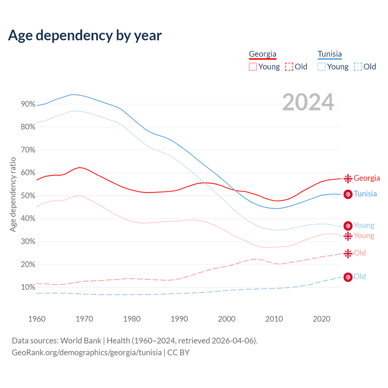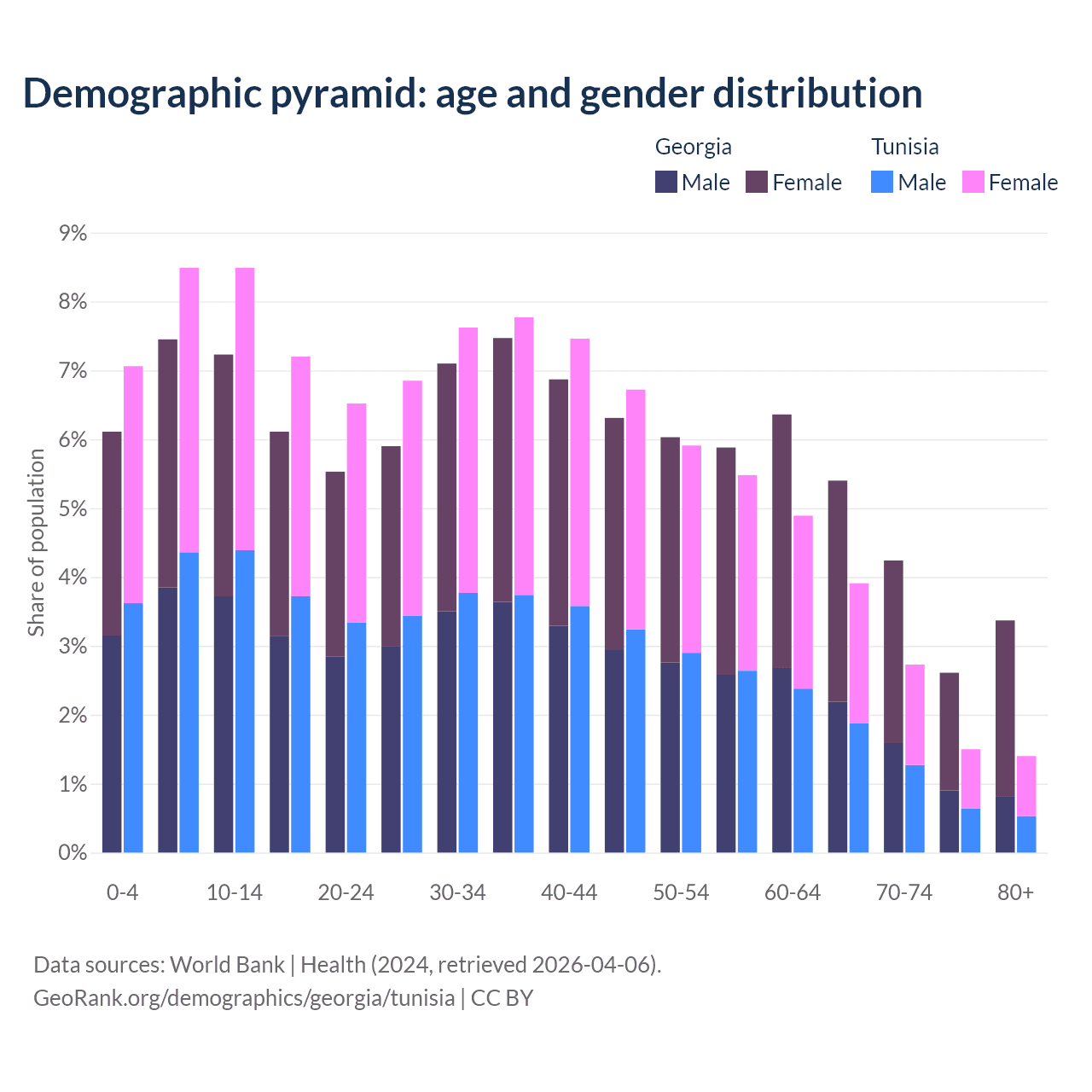 - Georgia is ranked 59/196 by median age (oldest to youngest) vs 86/196 for Tunisia.