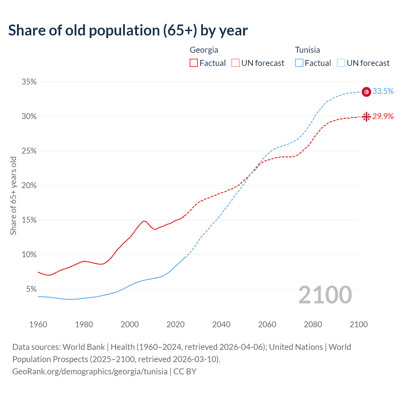 The share of older people aged 65 and over is 15.6% in Georgia and 9.53% in Tunisia. Life expectancy in Georgia compared to Tunisia .