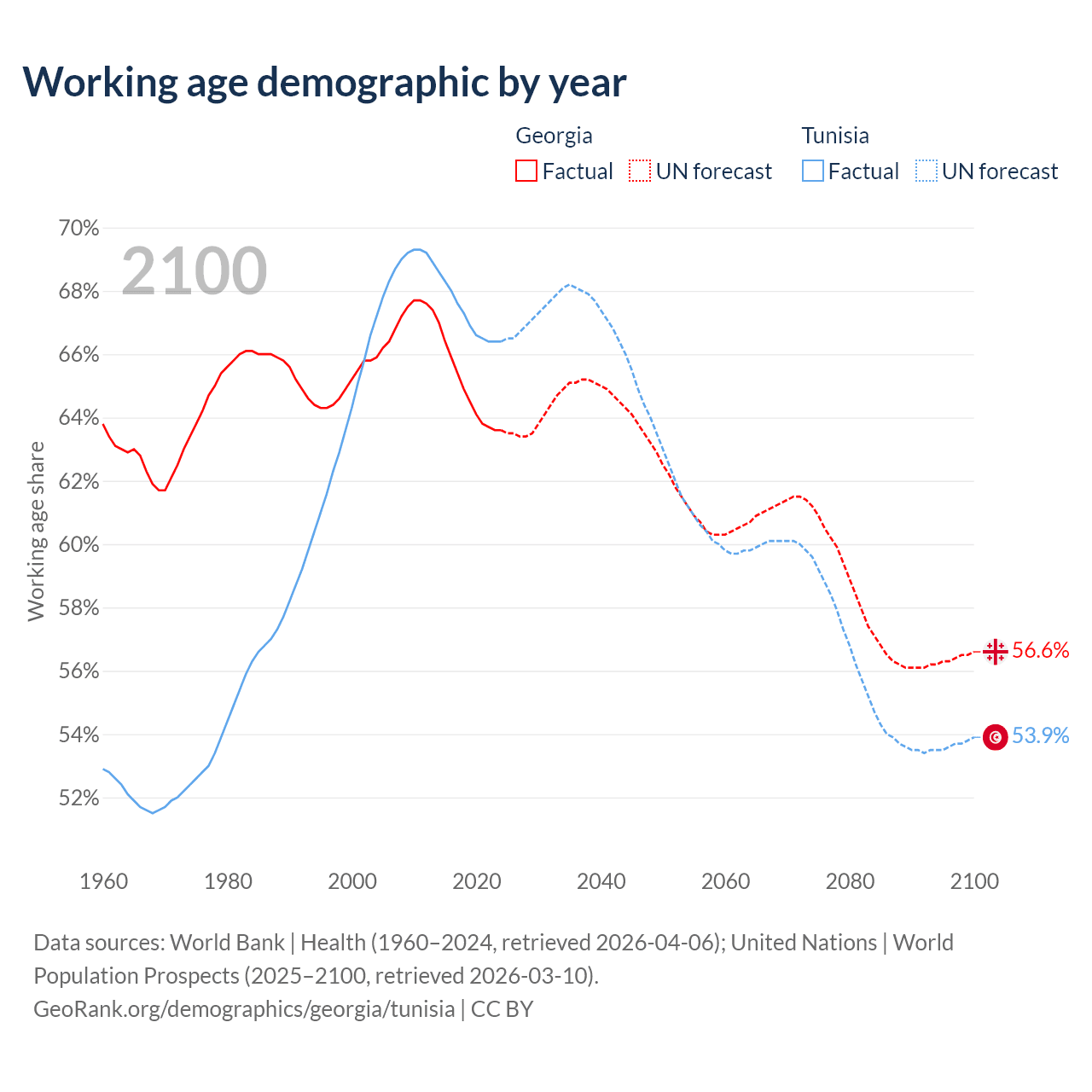 - Georgia has 2.35M working age adults (aged 15-64) vs 8.26M in Tunisia.