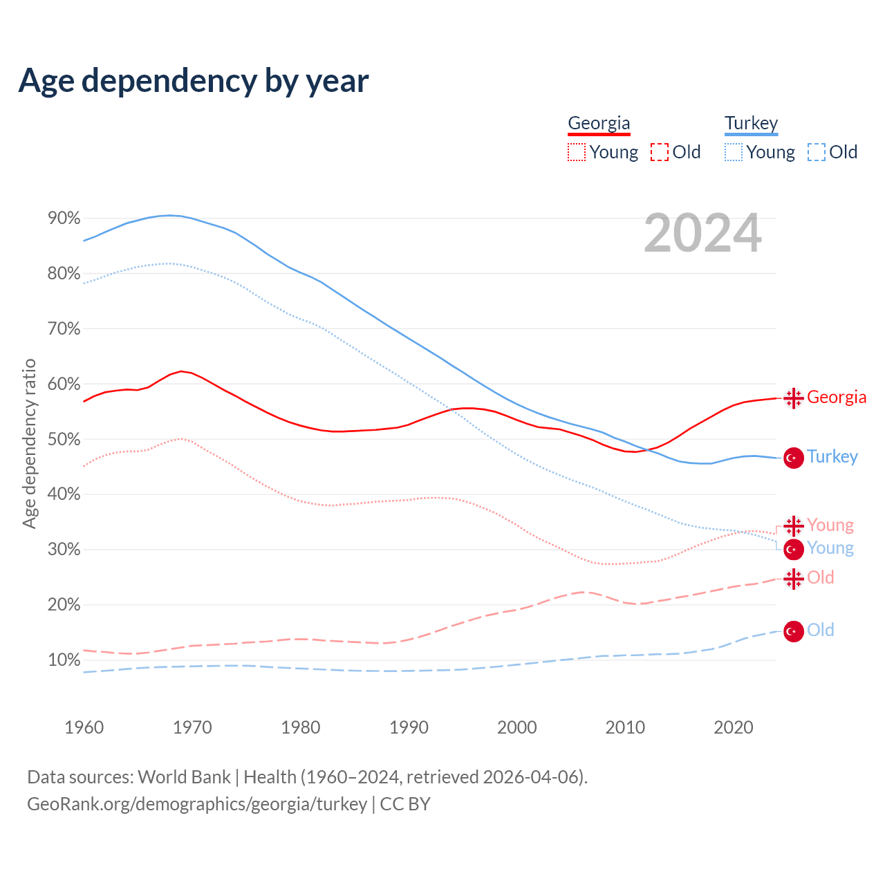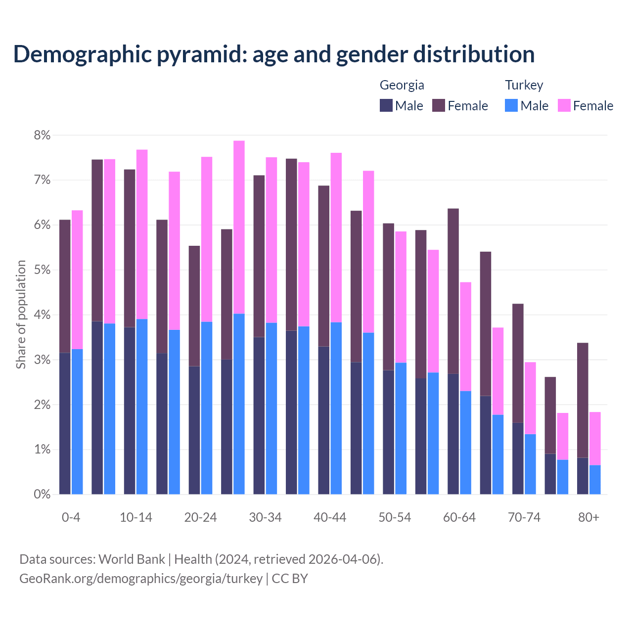 - Georgia is ranked 59/196 by median age (oldest to youngest) vs 83/196 for Turkey.