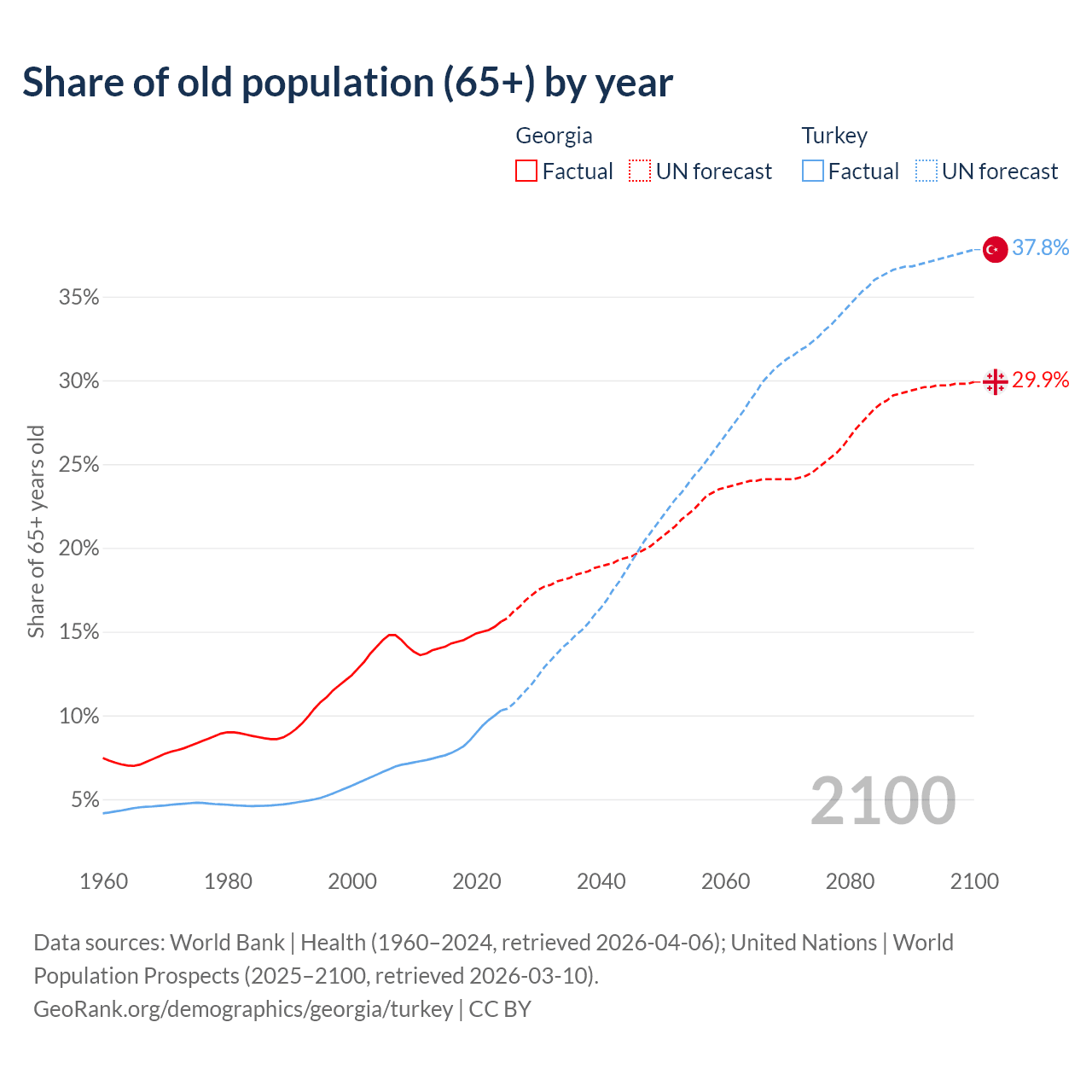 The share of older people aged 65 and over is 15.6% in Georgia and 10.3% in Turkey. Life expectancy in Georgia compared to Turkey .