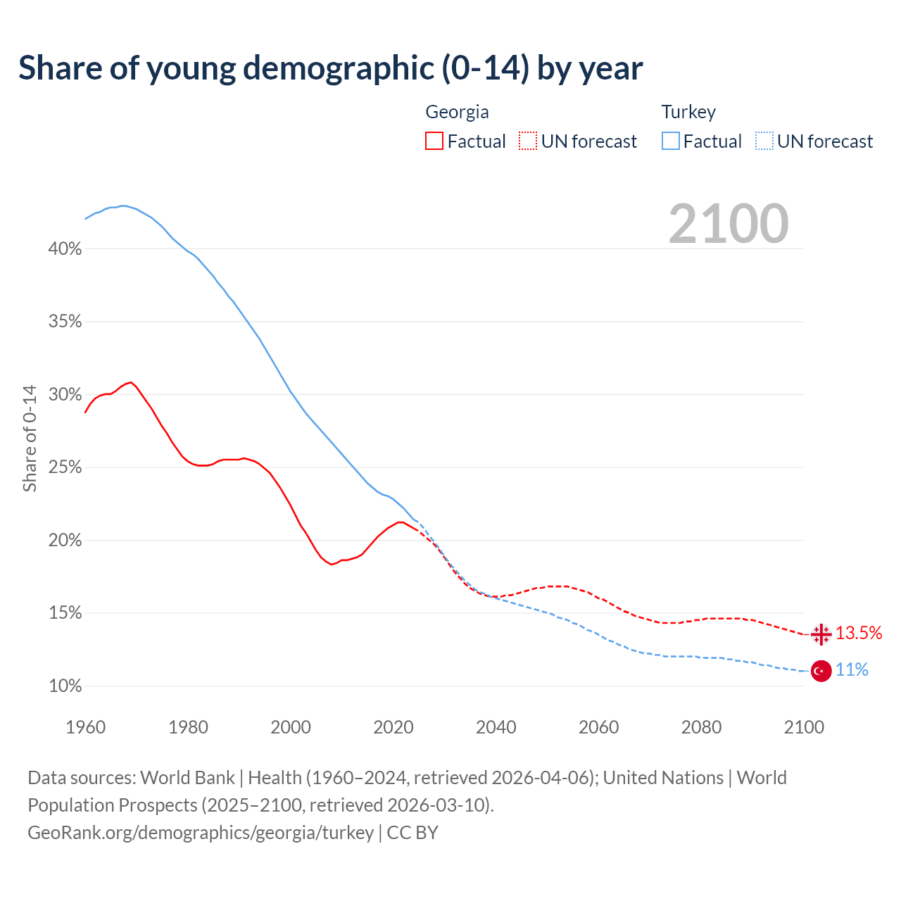 - The share of young demographic (0-15 years old) in Georgia is 20.8% vs 21.4% in Turkey.