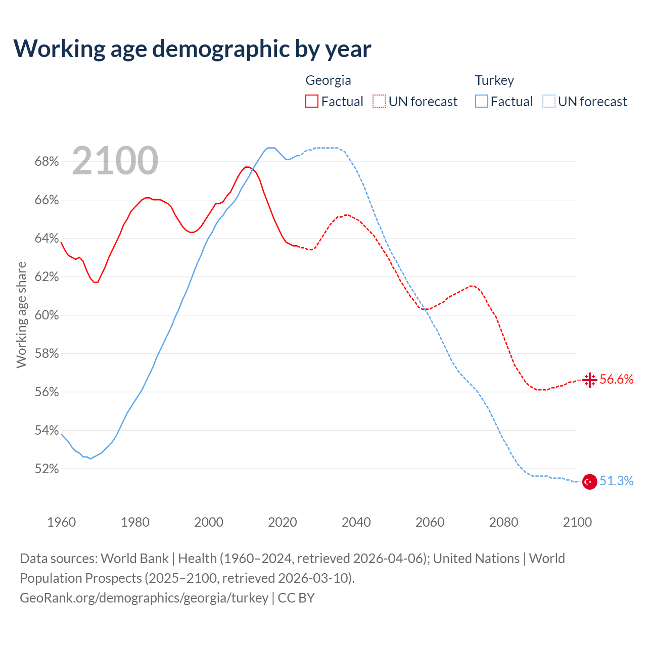 - Georgia has 2.35M working age adults (aged 15-64) vs 58.7M in Turkey.