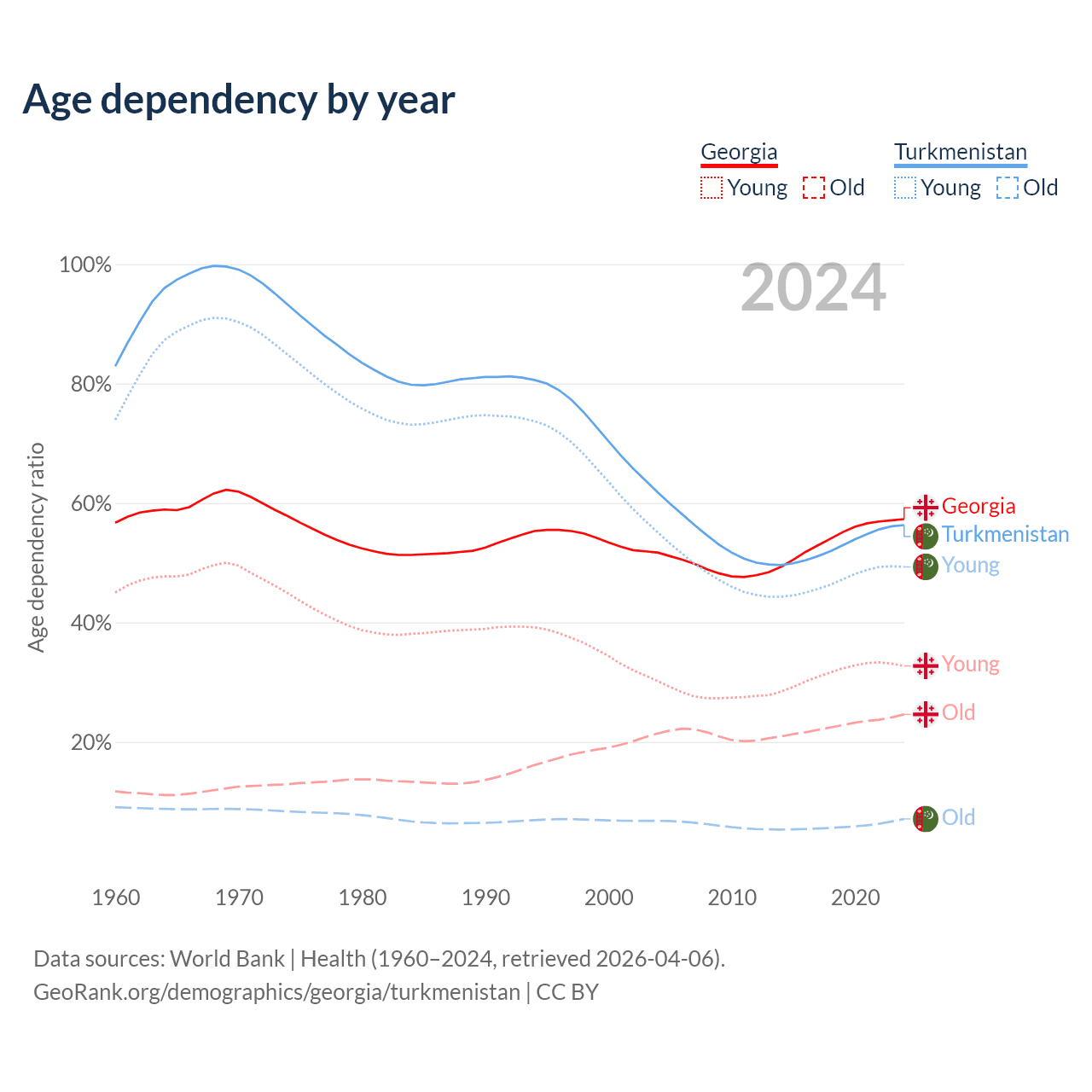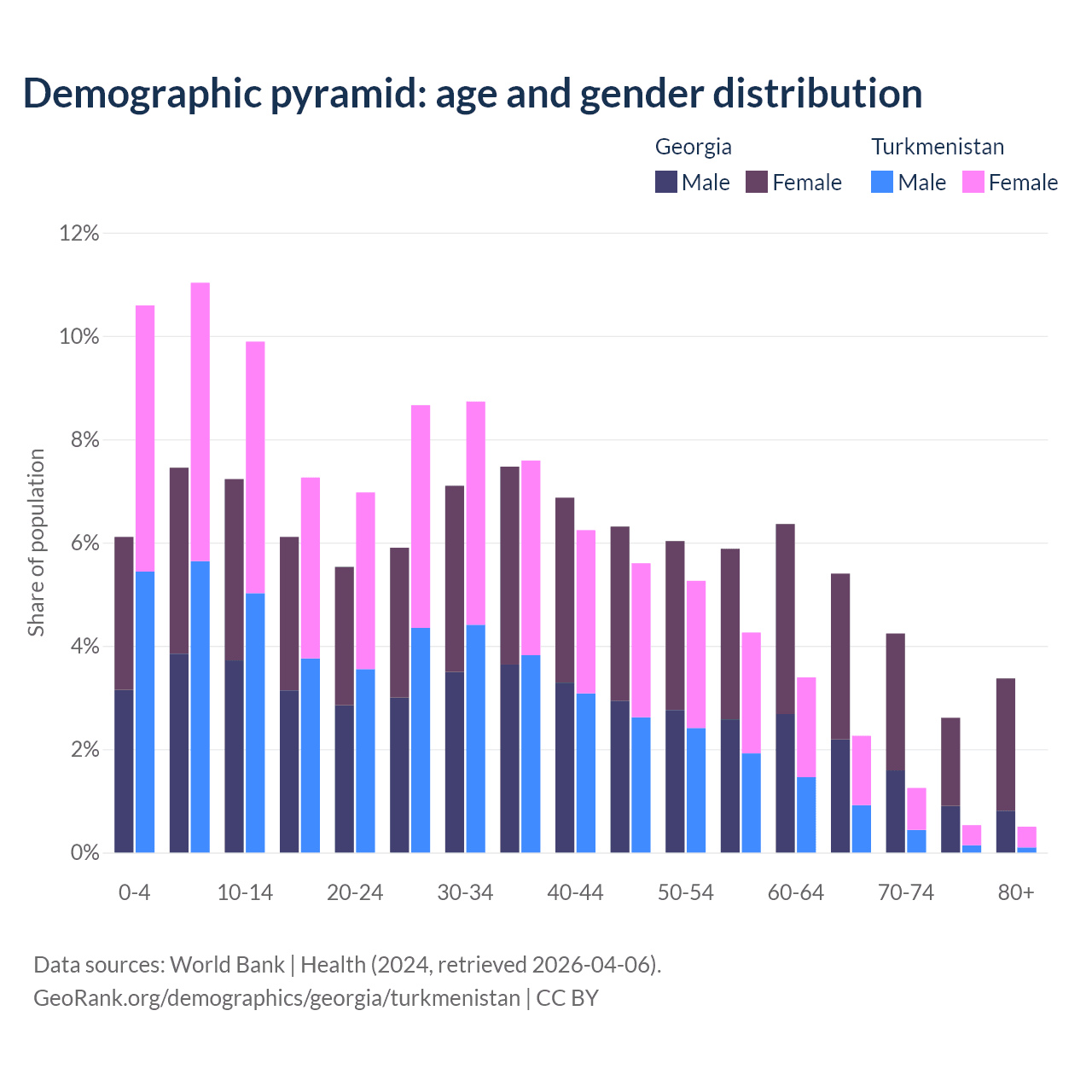 - Georgia is ranked 59/196 by median age (oldest to youngest) vs 119/196 for Turkmenistan.