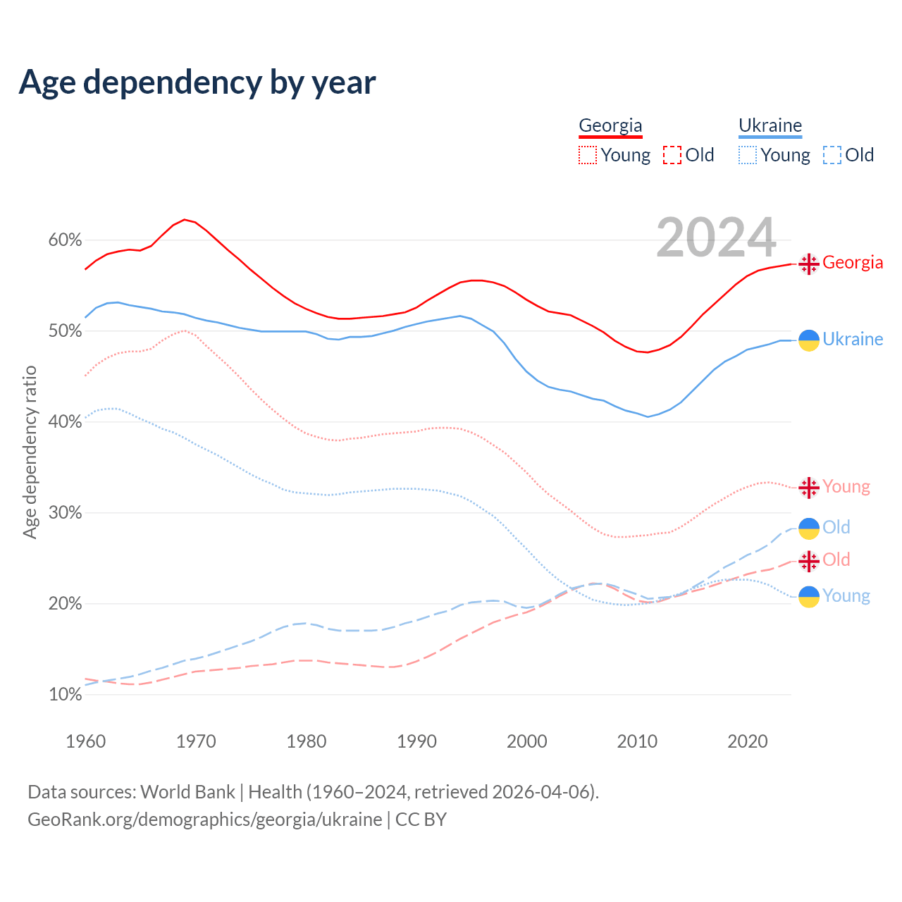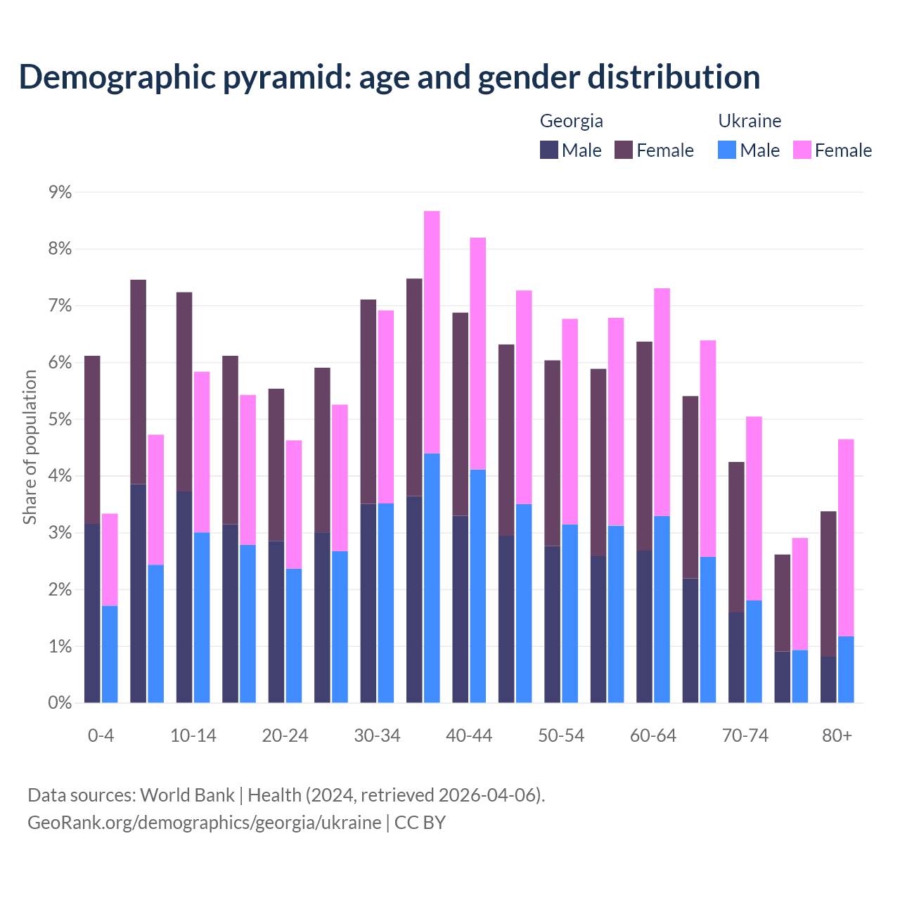- Georgia is ranked 59/196 by median age (oldest to youngest) vs 26/196 for Ukraine.