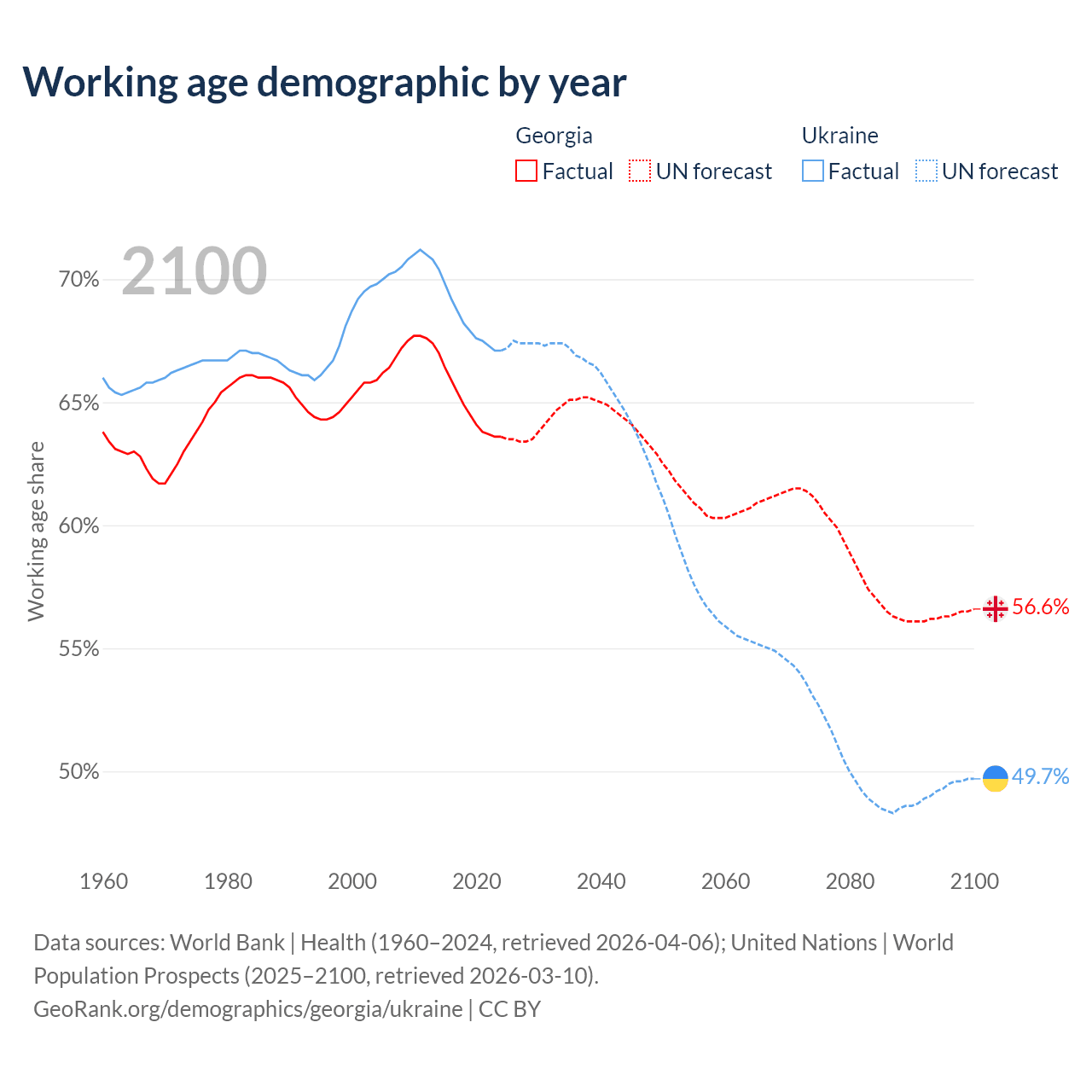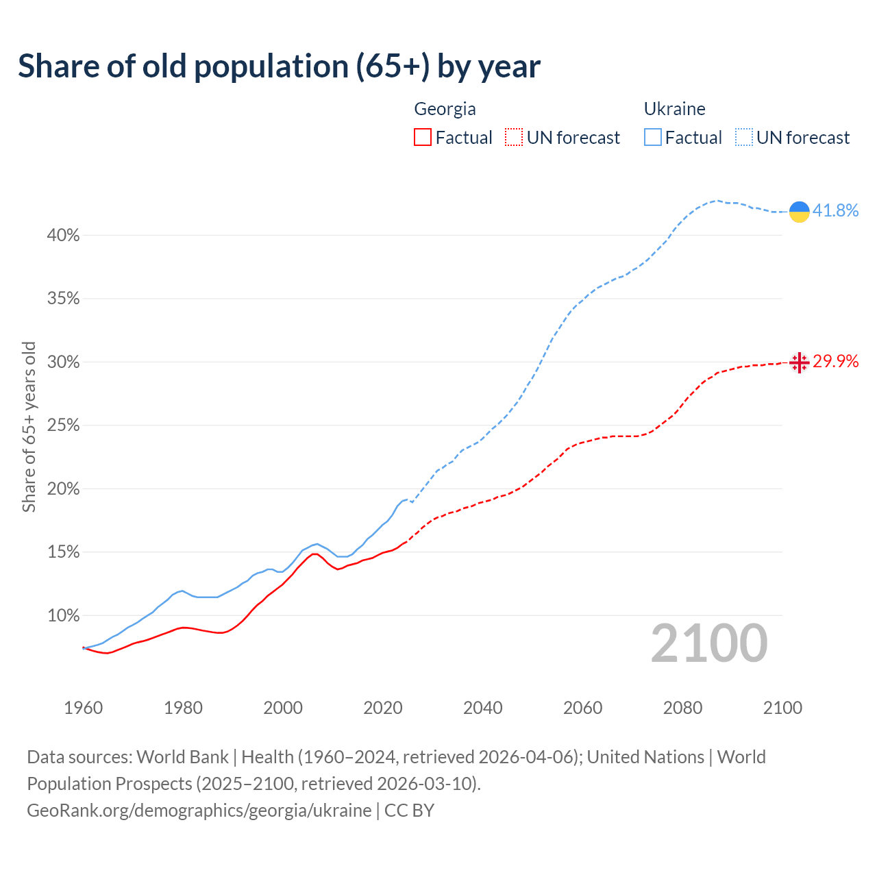 Median age Georgia vs Ukraine, 1960-2100