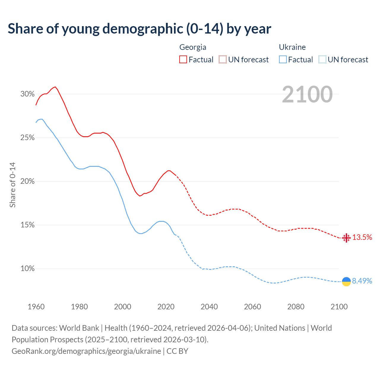 - The share of young demographic (0-15 years old) in Georgia is 20.8% vs 13.9% in Ukraine.