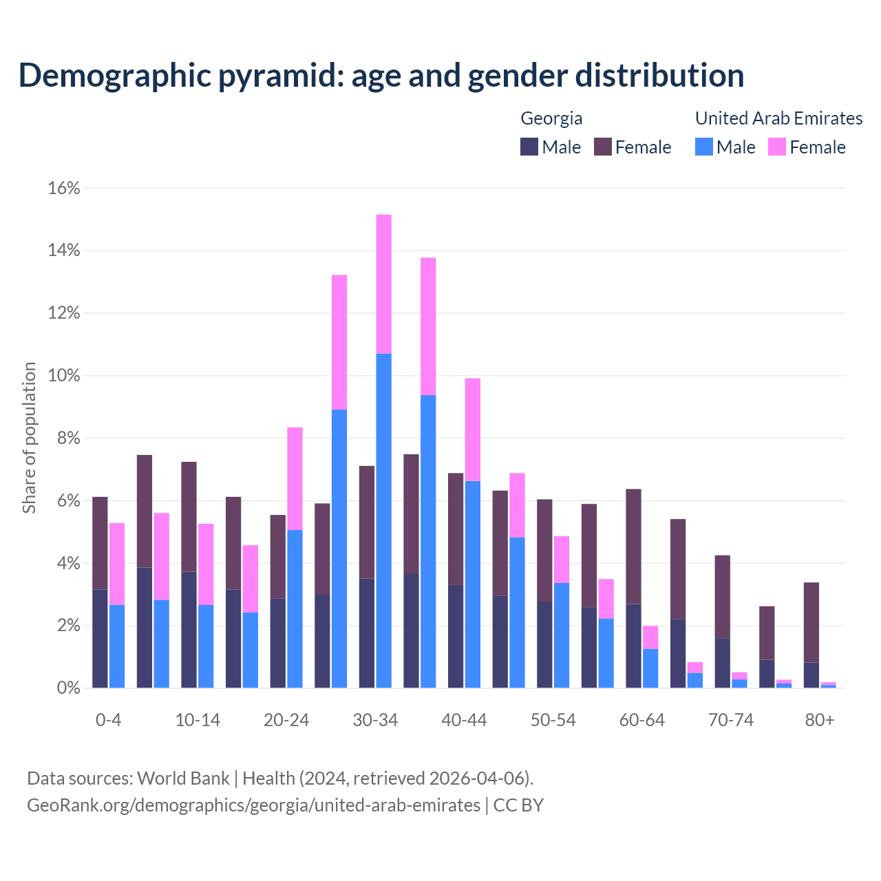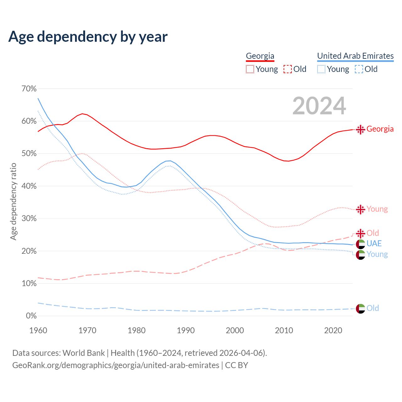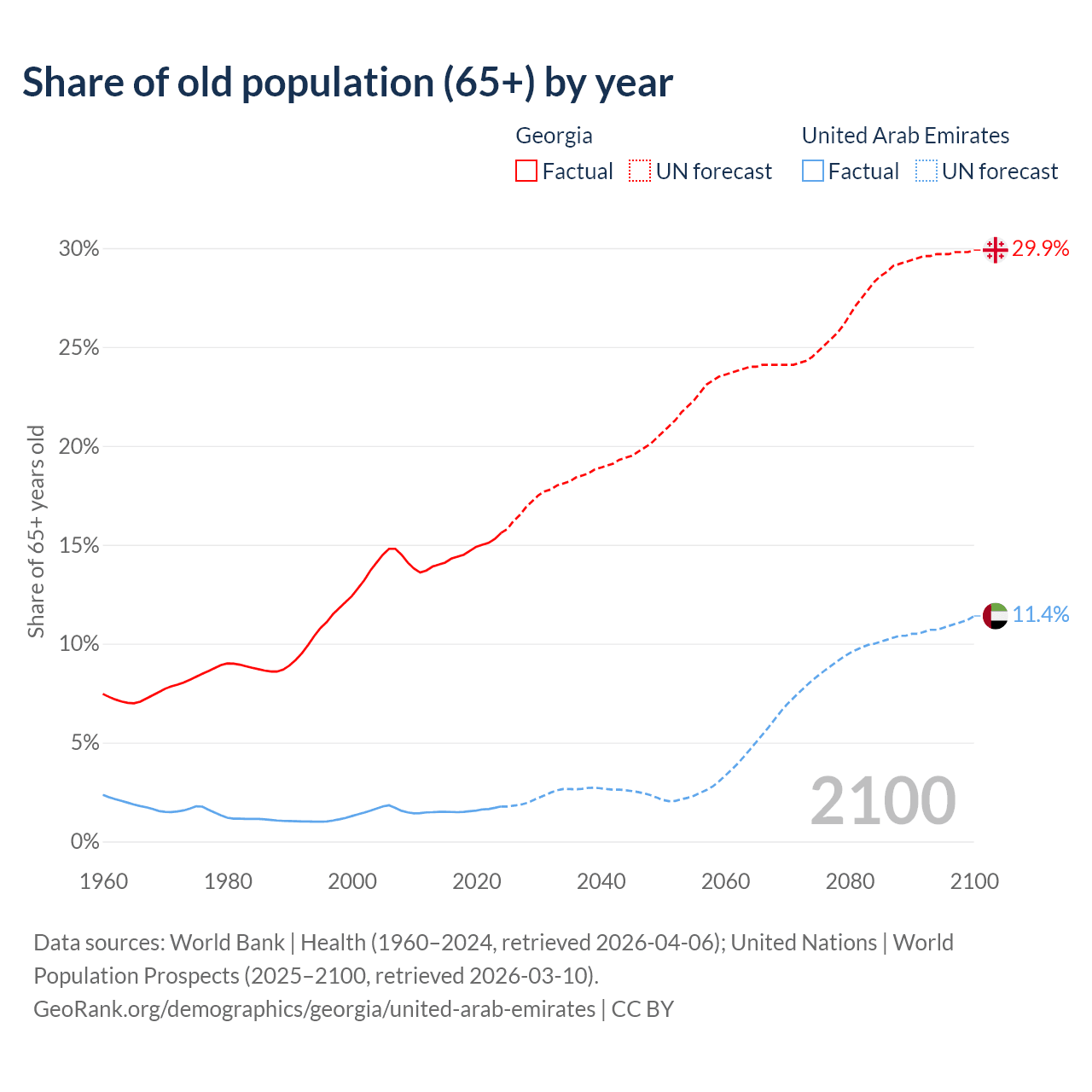 - The share of old-age demographic (65+) in Georgia is 15.6% vs 1.77% in the United Arab Emirates.
