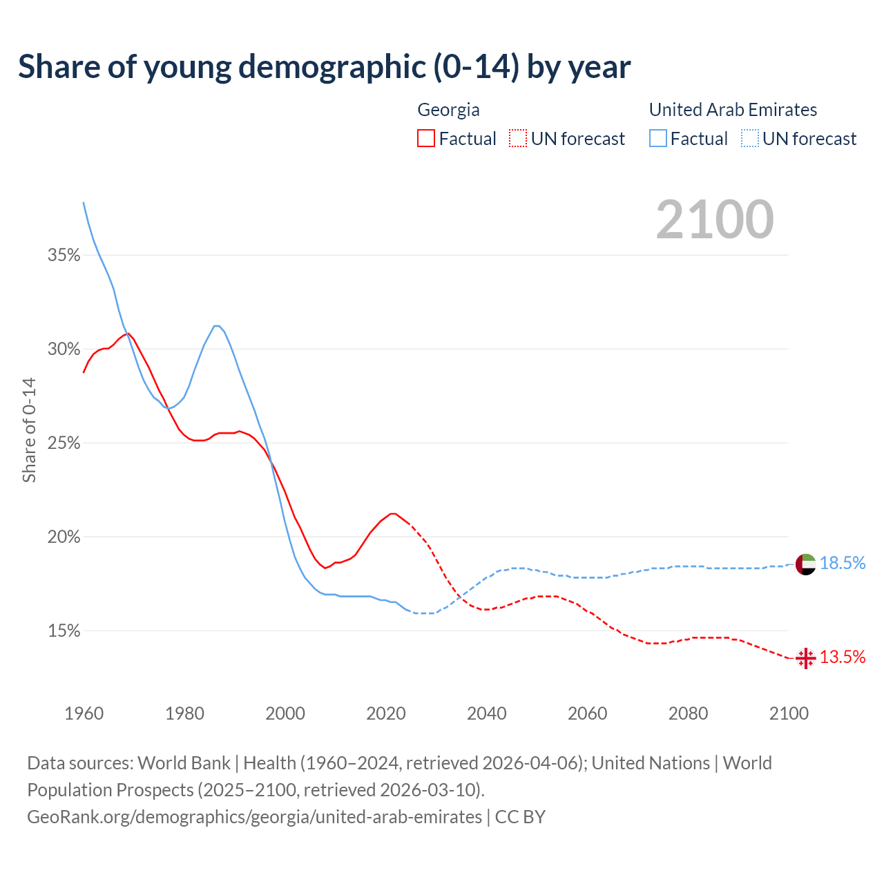 - The share of young demographic (0-15 years old) in Georgia is 20.8% vs 16.1% in the United Arab Emirates.