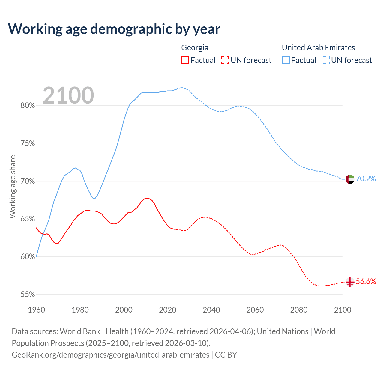 - Georgia has 2.35M working age adults (aged 15-64) vs 9.6M in the United Arab Emirates.