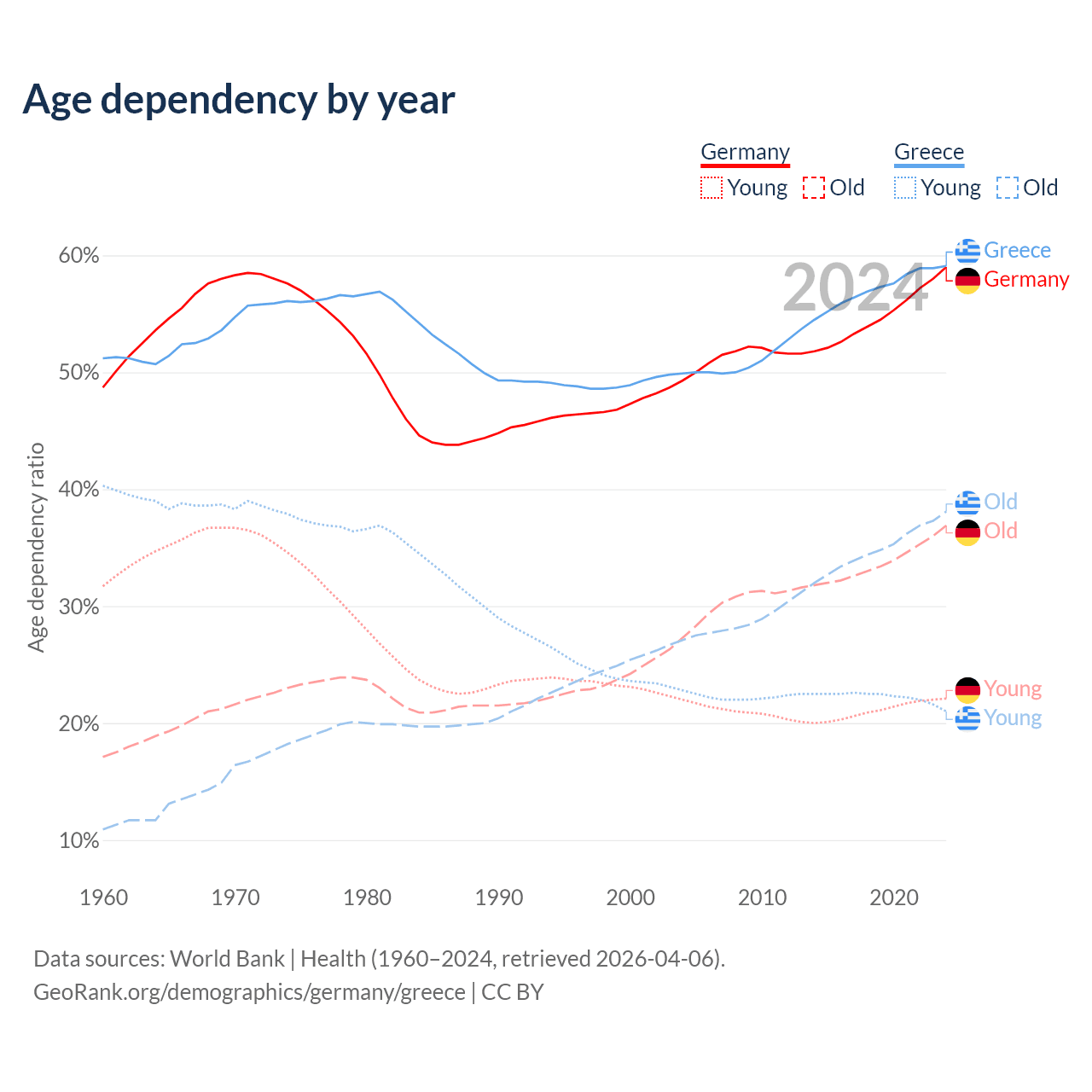 - Germany is ranked 9/196 by median age (oldest to youngest) vs 6/196 for Greece.