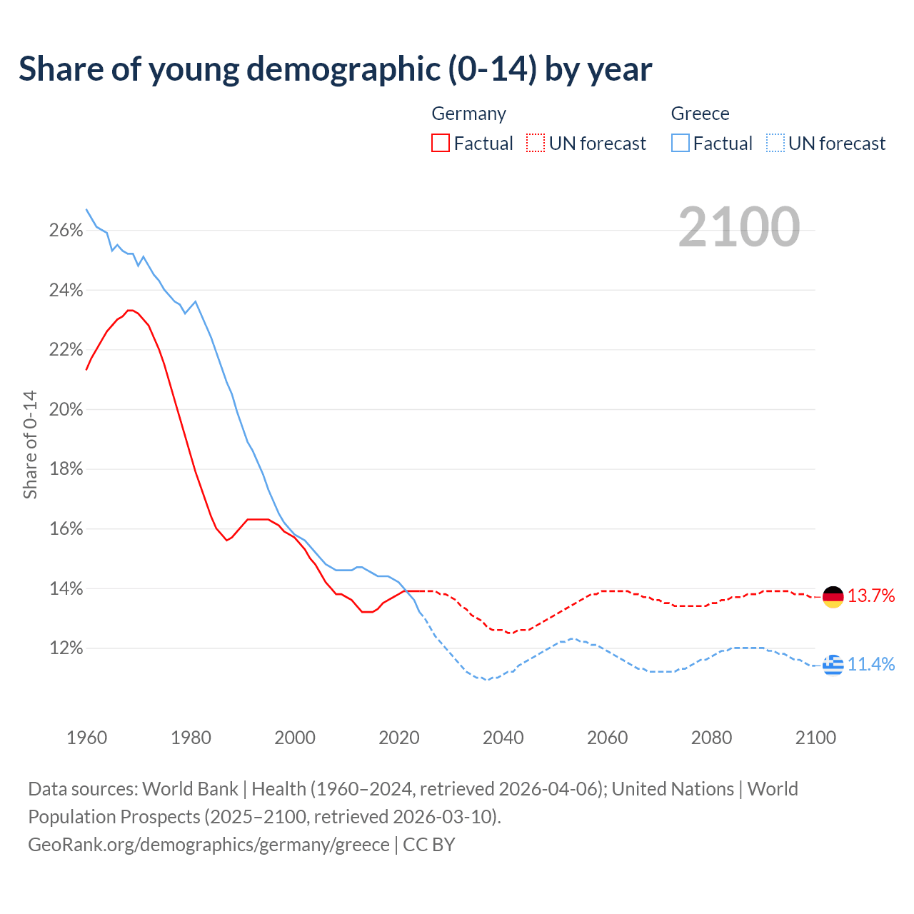- The share of young demographic (0-15 years old) in Germany is 13.9% vs 13.2% in Greece.