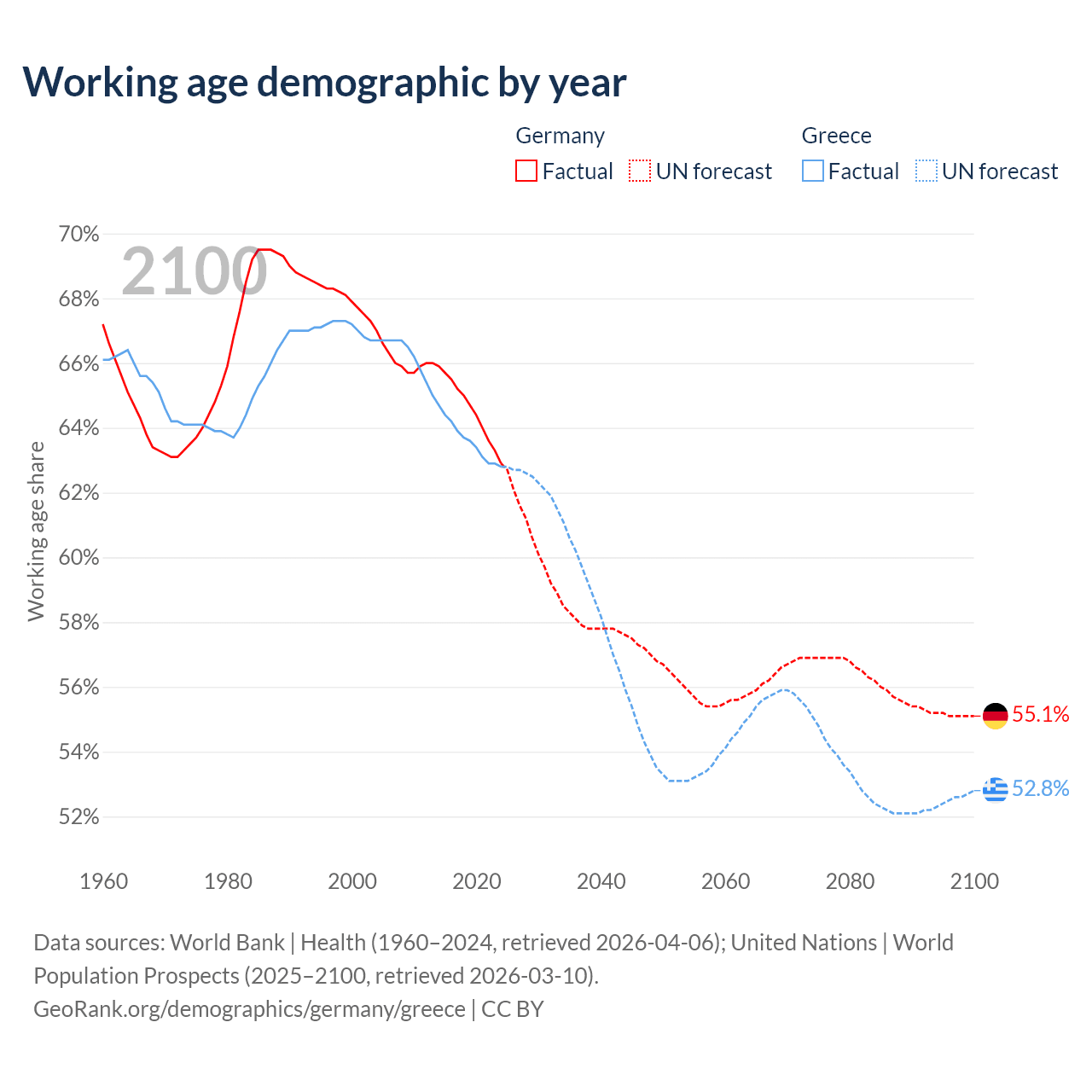 Median age Germany vs Greece, 1960-2100