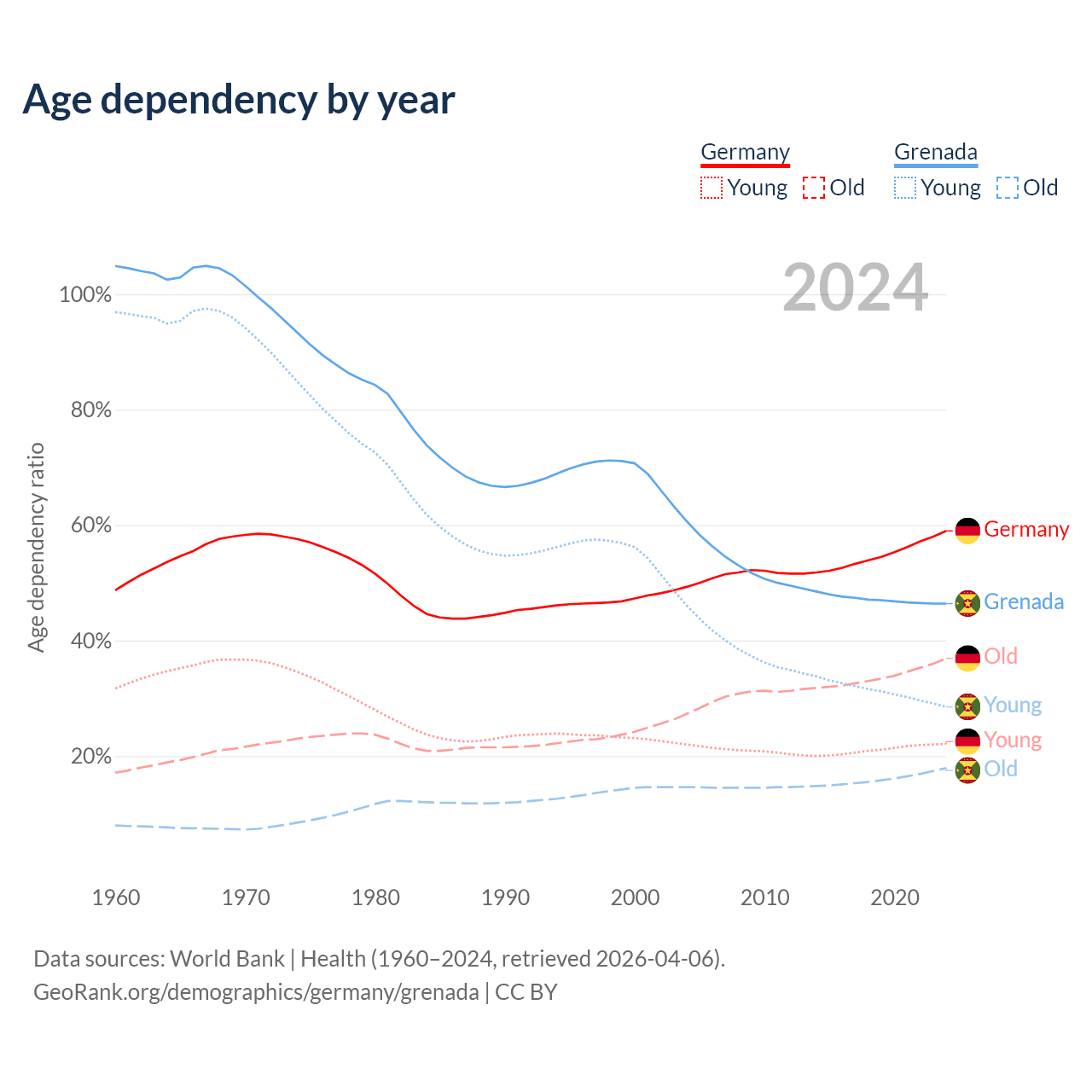 - Germany is ranked 9/196 by median age (oldest to youngest) vs 77/196 for Grenada.