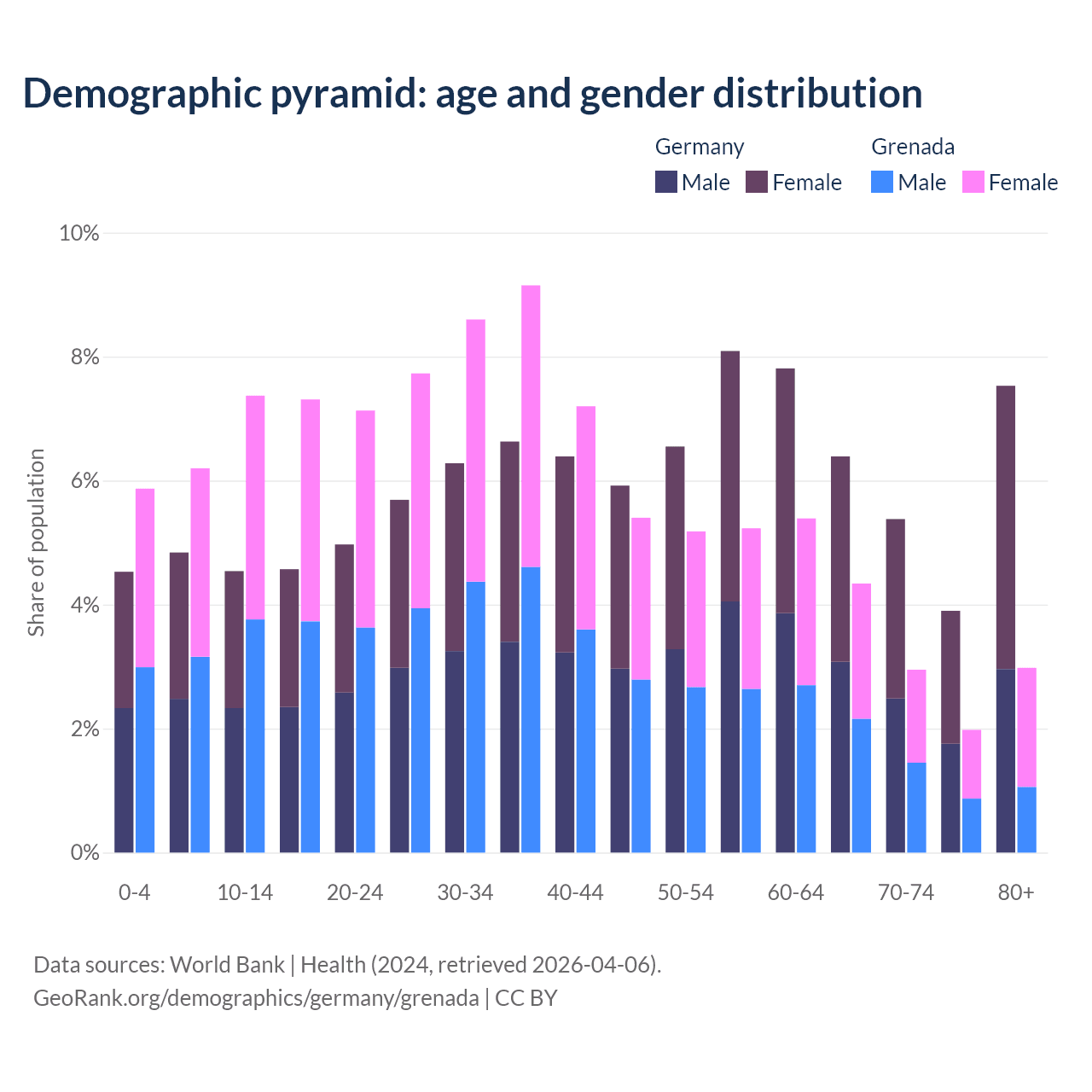 - As of 2026, the population of Germany is 82.6M vs 117K in Grenada - 703 times difference.