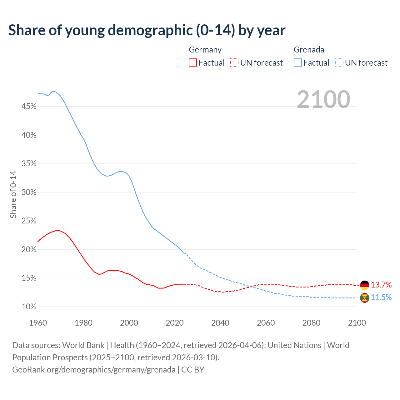 - The share of young demographic (0-15 years old) in Germany is 13.9% vs 19.4% in Grenada.