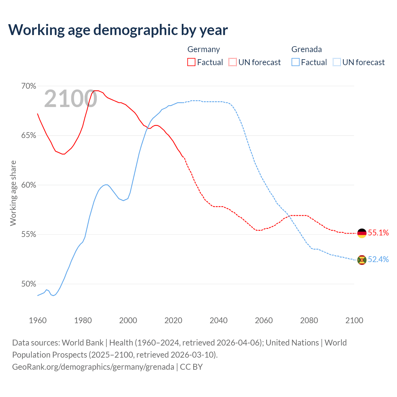 - Germany has 51.9M working age adults (aged 15-64) vs 80.2K in Grenada.