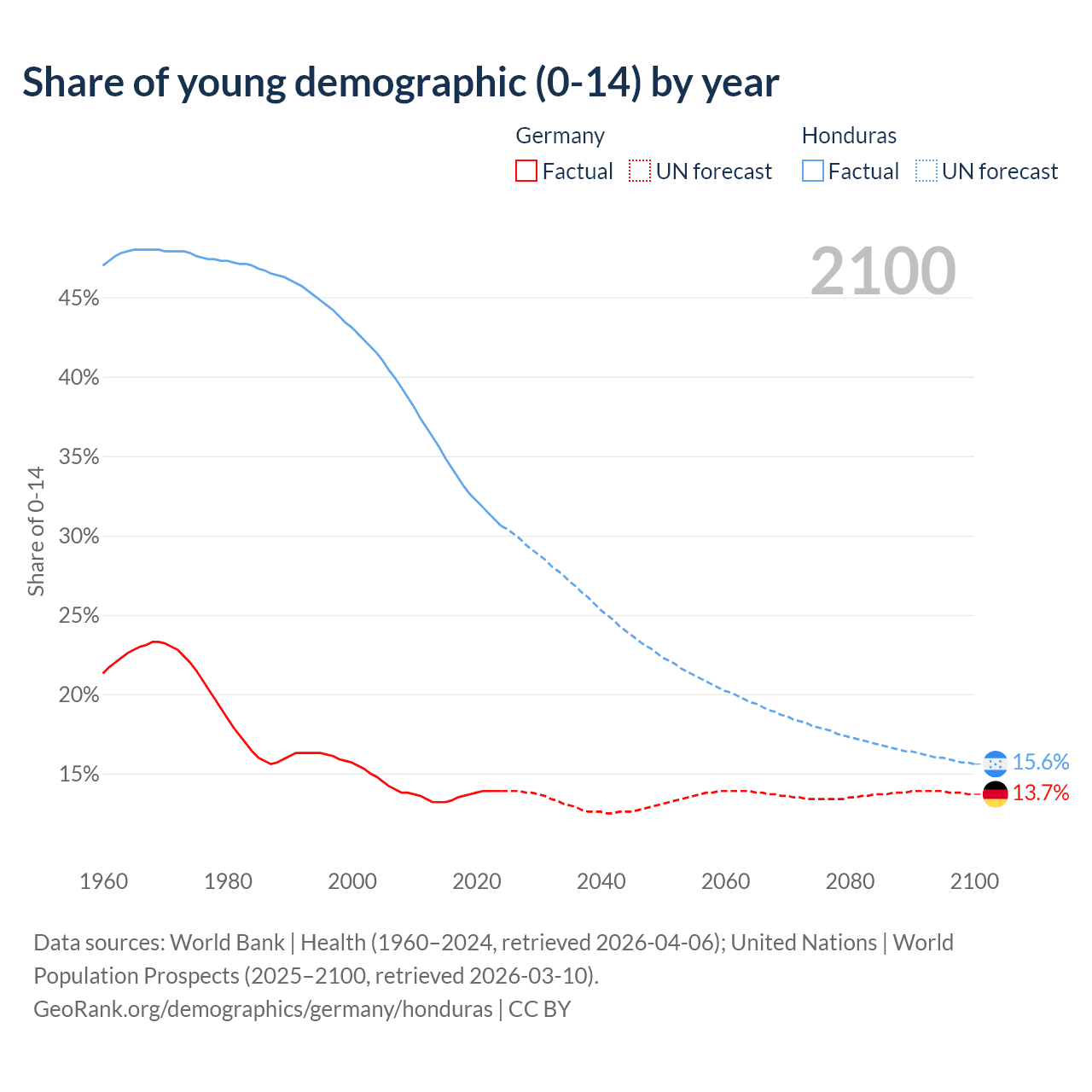- The share of young demographic (0-15 years old) in Germany is 13.9% vs 30.6% in Honduras.