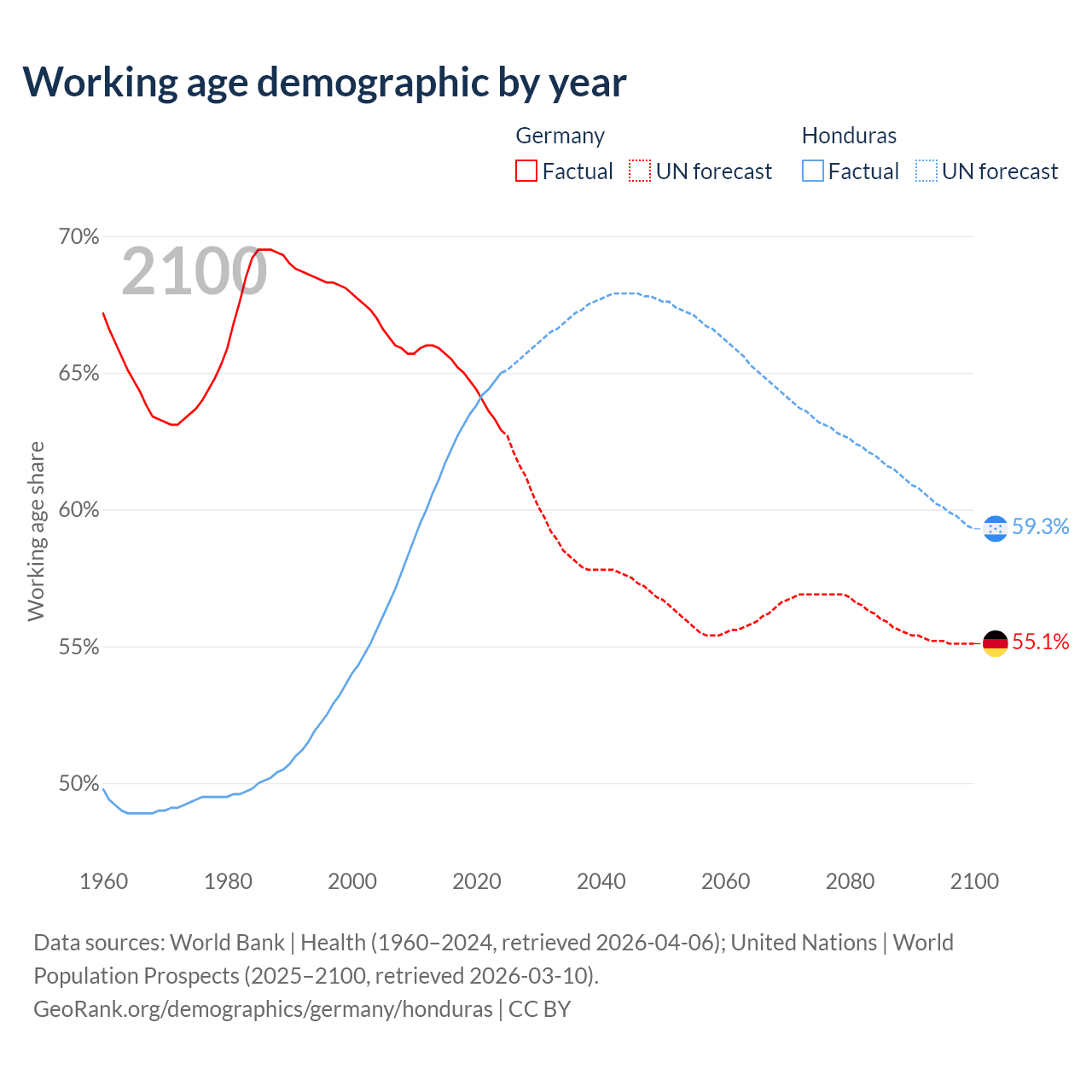 Median age Germany vs Honduras, 1960-2100