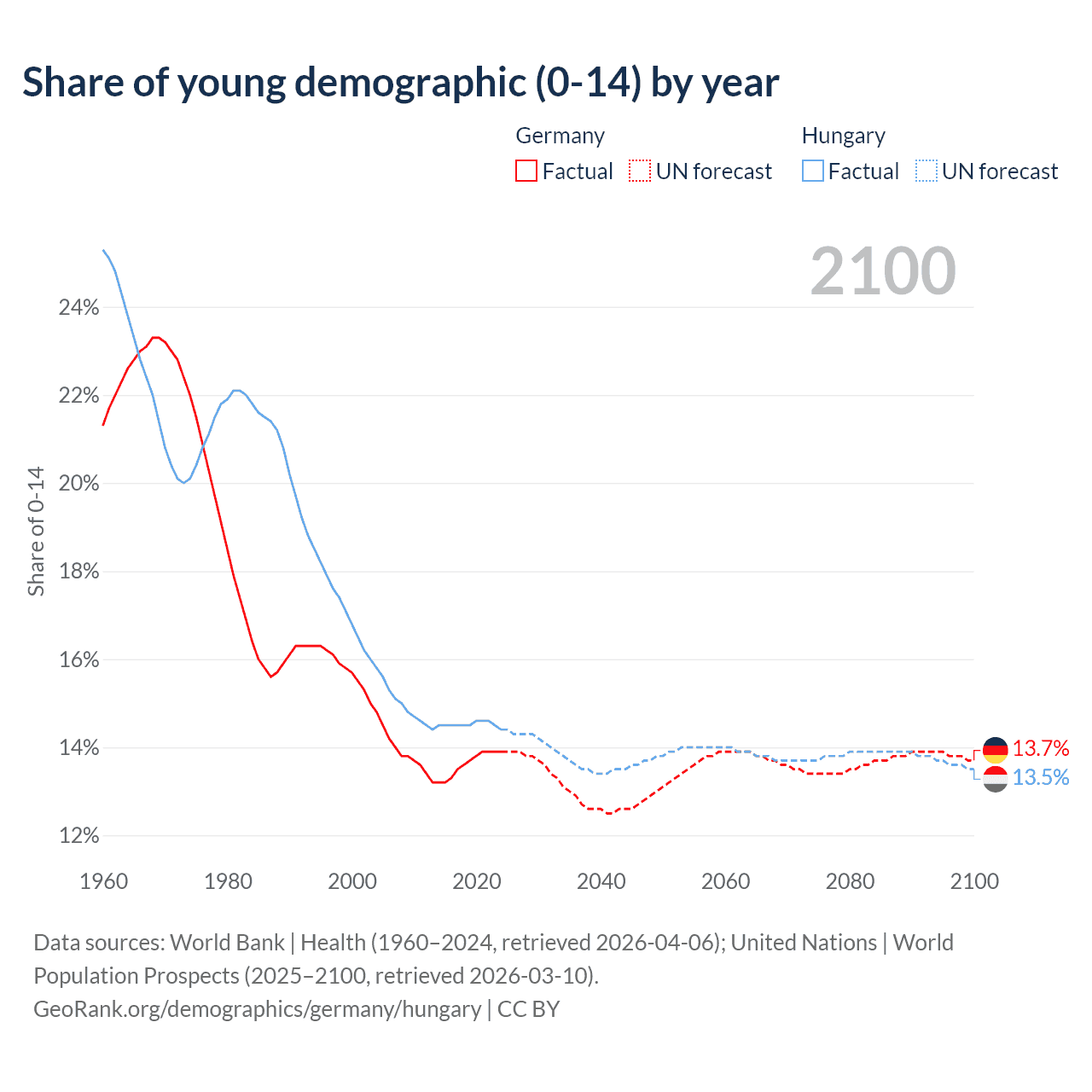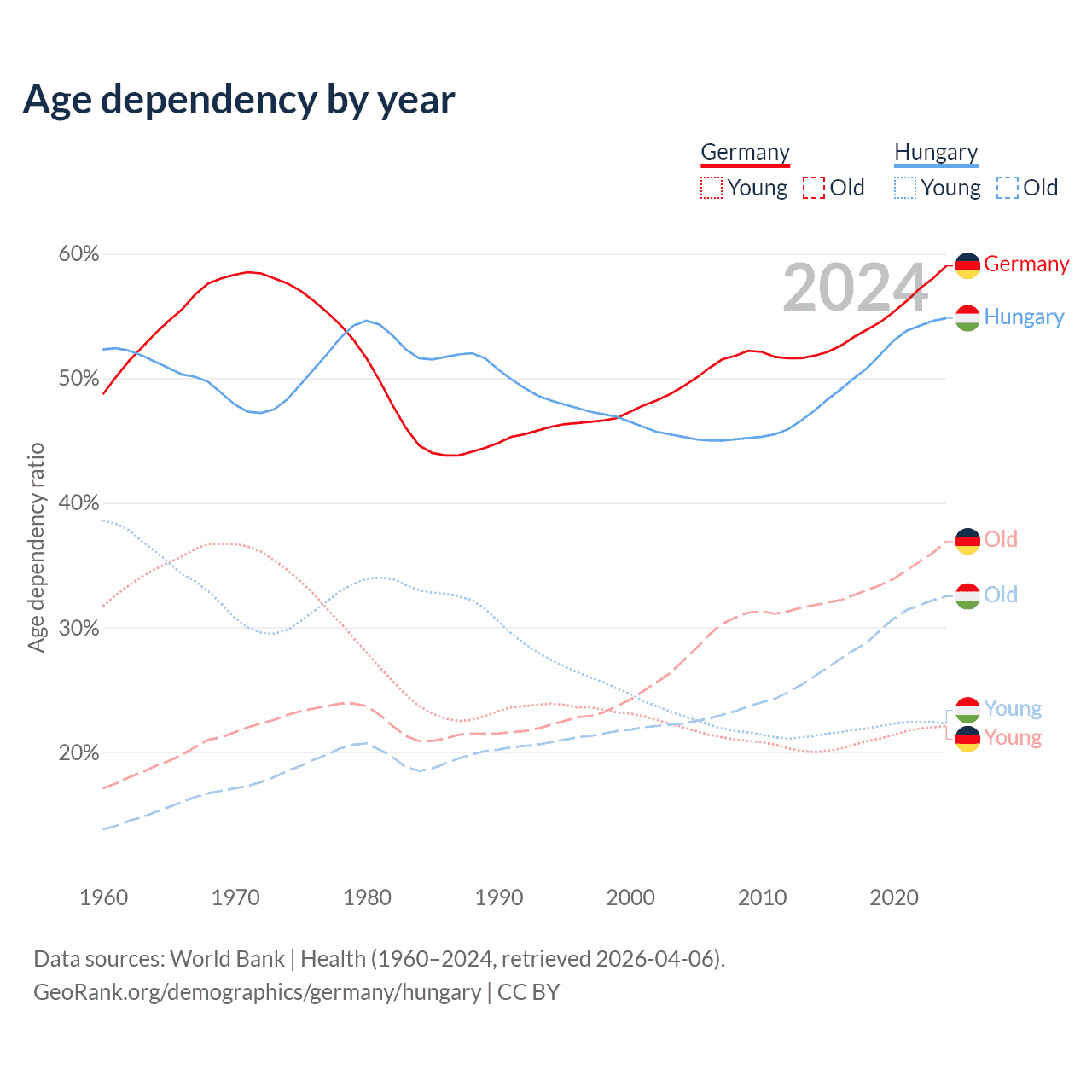 - Germany is ranked 9/196 by median age (oldest to youngest) vs 17/196 for Hungary.